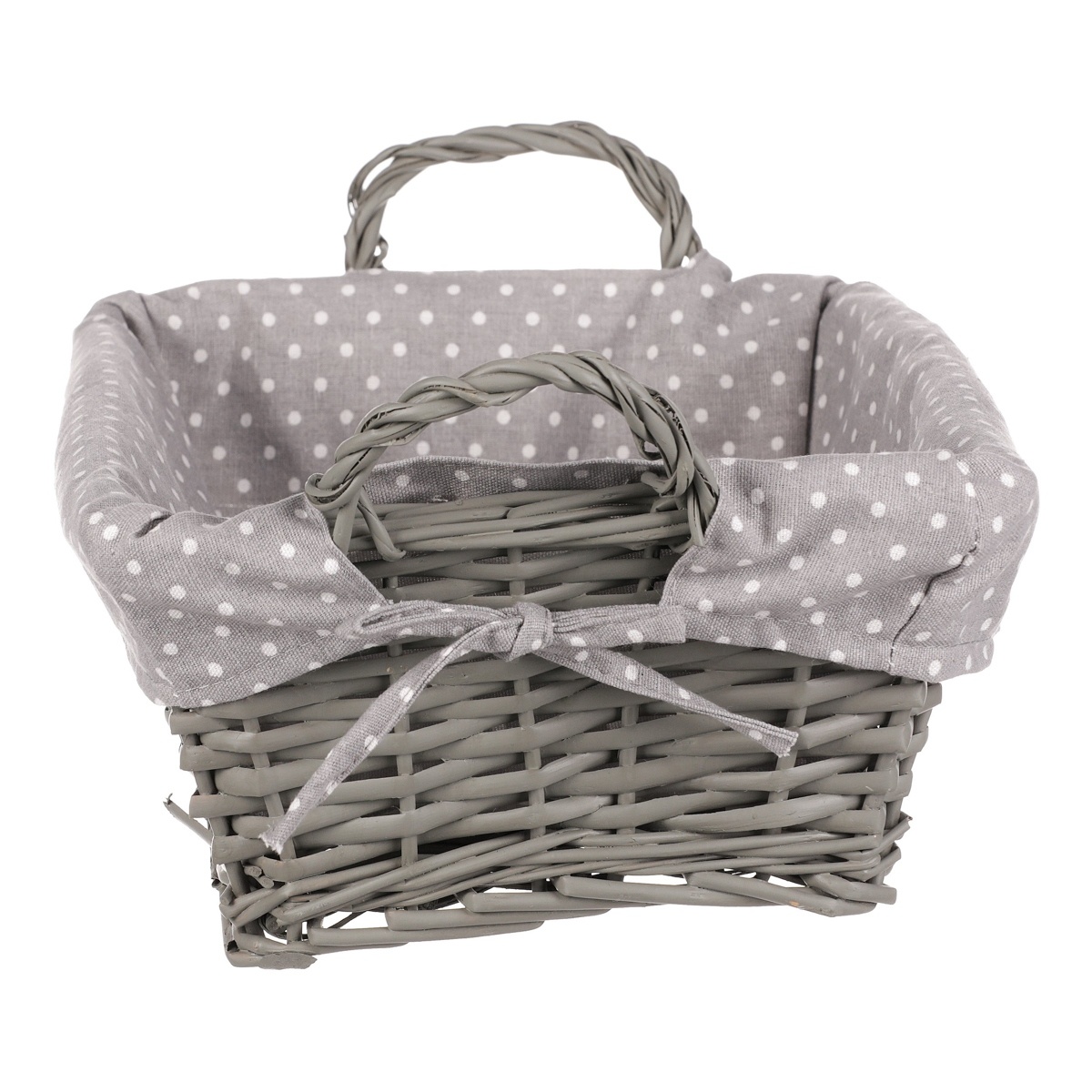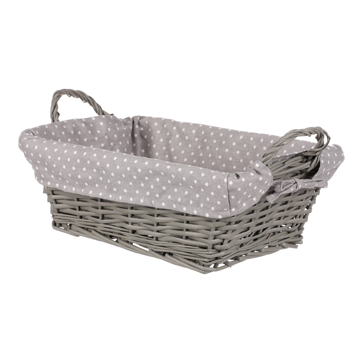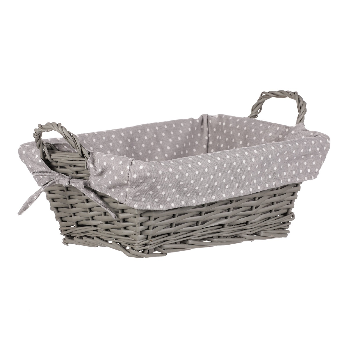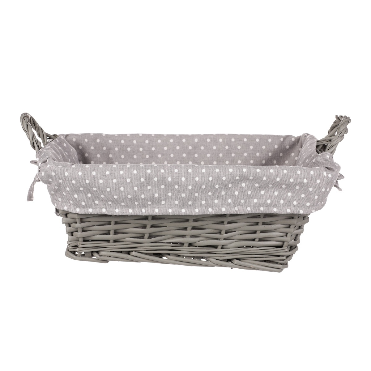 Tento prútený košík vystlaný bodkovanou látkou je výborným pomocníkom pre milovníkov prírodných materiálov, ktorí sa snažia udržiavať poriadok v regáloch a na poličkách. Je v neutrálnej sivej farbe a má po stranách dve uši, ktoré uľahčujú manipuláciu s ním. Vďaka svojmu jednoduchému a prirodzenému dizajnu sa dokonale hodí do rôznych typov interiérov. Môžete ho využiť na uskladnenie a usporiadanie rôznych vecí, od kníh a hračiek po textílie a rôzne drobnosti. Tento košík vám nielen pomôže udržiavať nastolený poriadok, ale taktiež prinesie do vášho priestoru príjemný nádych prírodnej elegancie.