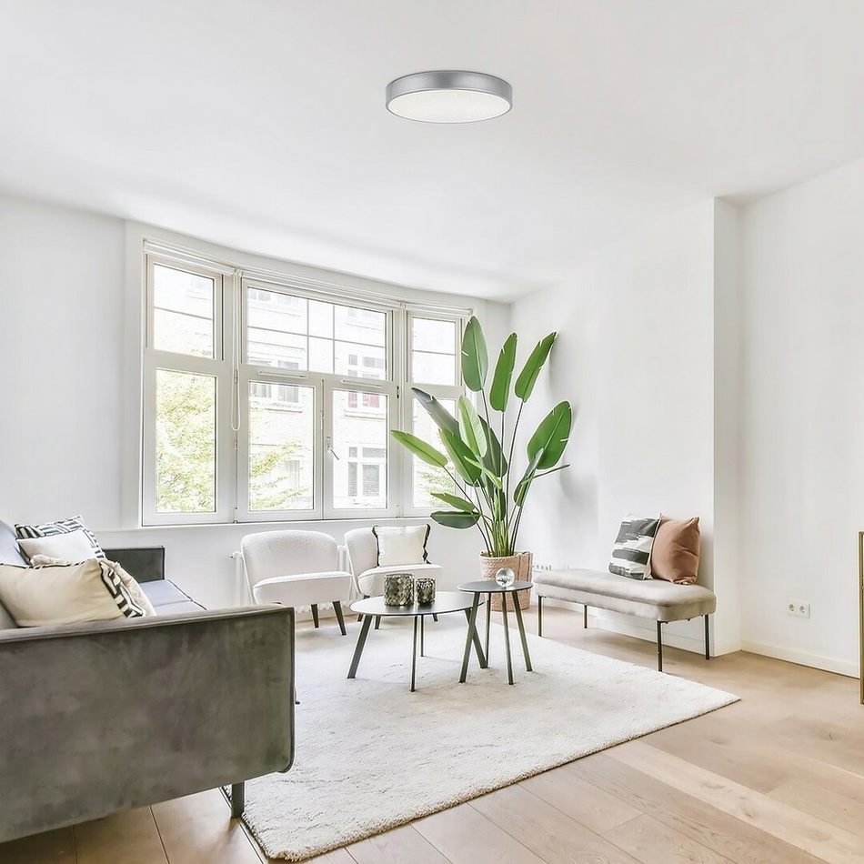 Okrúhle stropné svietidlo Octav s hviezdnym efektom môže byť praktickým kúskom takmer každej modernej obývacej izby, spálne alebo pracovne. Kovové svietidlo striebornej farby je doplnené o biele plastové tienidlo.Svietidlo Octav obsahuje vstavaný LED svetelný zdroj s výkonom 26 W, svetelným tokom 1660 lúmenov a mimoriadnou životnosťou 50 000 hodín! Teplota farby stropného svietidla je 4000 K a vyžaruje prirodzené biele svetlo.