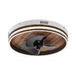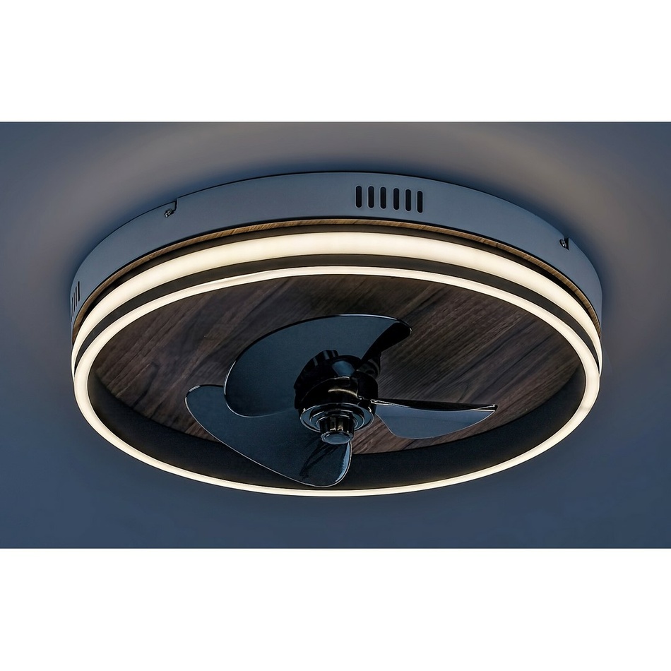 Stropné svietidlo Faustine s ventilátorom môže byť praktickou a všestrannou voľbou do modernej obývacej izby. Čierna lampa vyrobená z kovu je doplnená o dyhovú ozdobnú dosku a priehľadné plastové tienidlo.