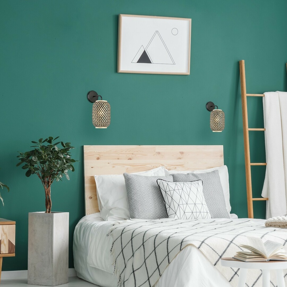 Nástenné svietidlo Adalla v škandinávskom štýle odporúčame predovšetkým tým, ktorí majú radi modely z prírodných materiálov. Toto matné čierne kovové svietidlo, určené do obývacej izby alebo spálne, doplnené je o viacfarebné ratanové tienidlo v tvare suda a je možné ho pripevniť na stenu pomocou okrúhleho dekoratívneho podstavca.