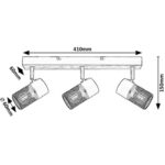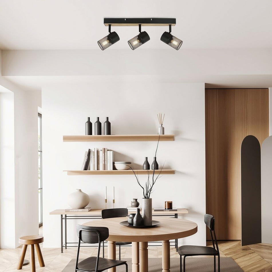 Trojité stropné bodové svietidlo Metta v industriálnom štýle sa odporúča predovšetkým do obývacej izby alebo spálne. Model v dubovej farbe, vyrobený z kovu a dreva, je doplnený zo spodnej časti otvorenými tienidlami s čiernymi valcovitými mriežkami, a možno ho upevniť na strop pomocou podlhovastého obdĺžnikového ozdobného podstavca. Vďaka pohyblivým lampovým hlaviciam, ktoré sú umiestnené vedľa seba, môžete svetlo smerovať podľa svojich predstáv.Svietidlo Metta je možné používať s tromi svetelnými zdrojmi každý s maximálnym príkonom do 40 W a päticami typu E14. V závislosti na vašom vkuse a mieste inštalácie si môžete vybrať zdroje teplého alebo prirodzeného bieleho svetla. V spálni sa v stropnej lampe odporúča používať teplé biele žiarovky, ktoré pomôžu vytvoriť útulnú domácu atmosféru.Rozmery trojitého bodového svetla Metta sú tieto: šírka 410 mm, priemer tienidiel 60 mm, vzdialenosť od stropu 150 mm. Tento model sa dodáva bez svetelných zdrojov.