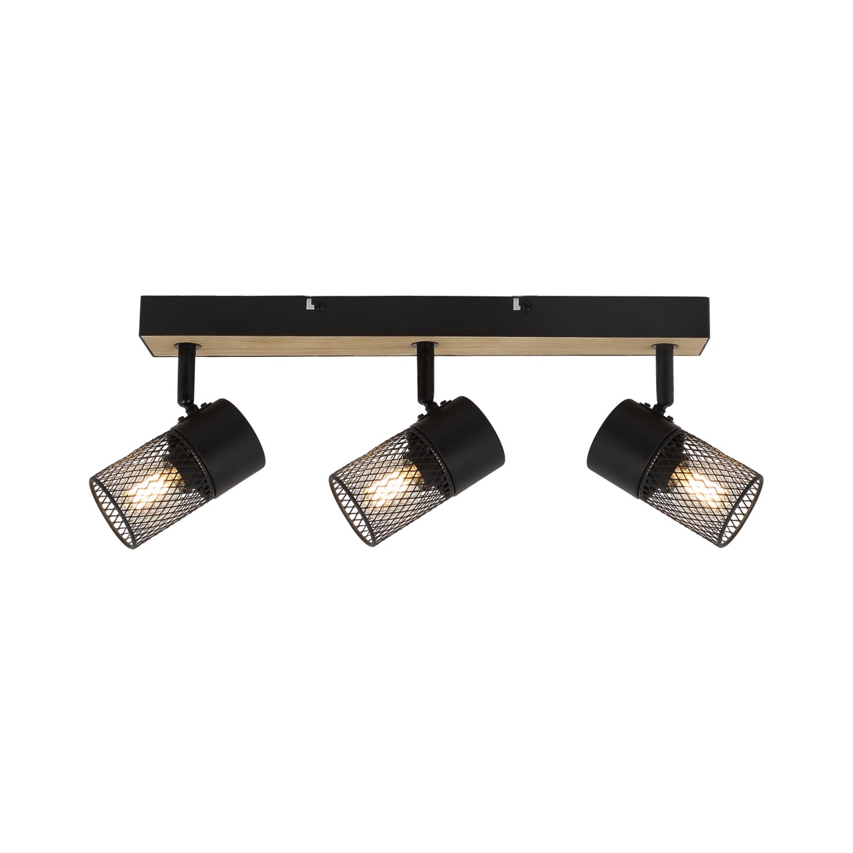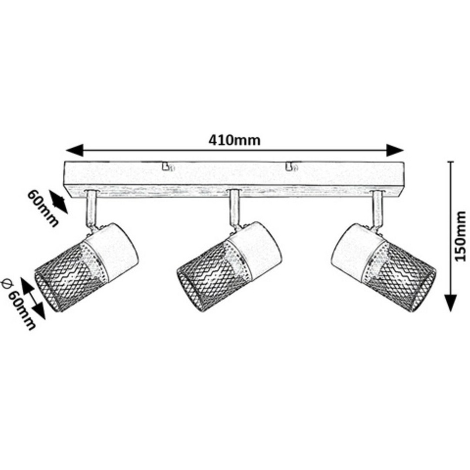 Trojité stropné bodové svietidlo Metta v industriálnom štýle sa odporúča predovšetkým do obývacej izby alebo spálne. Model v dubovej farbe, vyrobený z kovu a dreva, je doplnený zo spodnej časti otvorenými tienidlami s čiernymi valcovitými …
