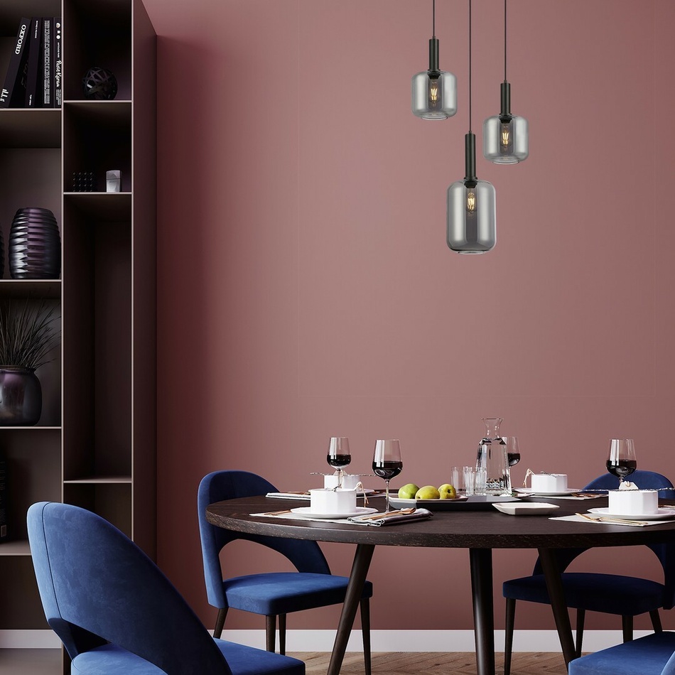 Trojitý záves Lissandra so svojim decentným, ale zároveň špeciálnym vzhľadom dobre zapadne do mnohých moderných zariadení obývačky. Matné čierne svietidlo z kovu je doplnené o väčšie a dve menšie valcové tienidlá z farebného skla. Záves je možné pripevniť na strop pomocou veľkej, okrúhlej ozdobnej základne, káble sú z textilu.