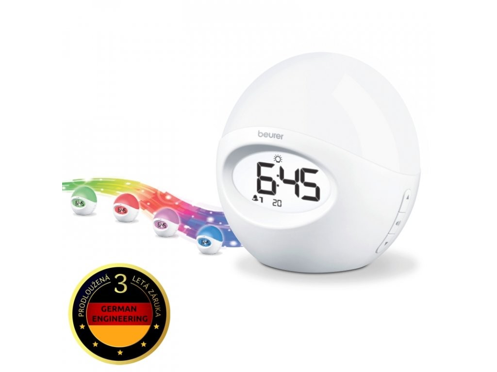 Prebuďte sa prirodzene jasným svetlom.Simulovaný východ slnka (15 alebo 30 min)budenie rádiom alebo zvukom budíka, možné nastaviť 2 časy budeniafunkcia Snooze (5-60min)10 predvolieb rádianastaviteľná intenzita svetlasvetlo meniace farbufarebne podsvietený LCD displejmožno použiť ako nočné lampyvr. AUX kábla (možnosť pripojenia mp3 prehrávače) vyrobené nemeckou spoločnosťou Beurer
