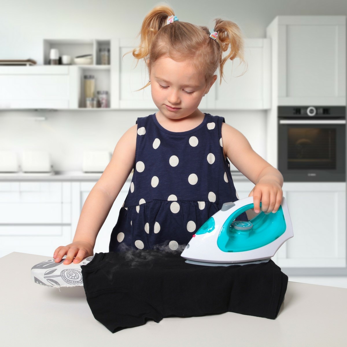 Plastová žehlička bielo-tyrkysovej farby, s ktorou budeš mať šatôčky pre svoje bábiky vždy perfektne vyžehlené! Doplň vodu do žehličky (pomocou fľaštičky v balení), pri stlačení tlačidla žehlička vydáva zvuk, svieti a vypúšťa paru. Funguje na 3 ks batérií typu AA, ktoré nie sú súčasťou balenia.