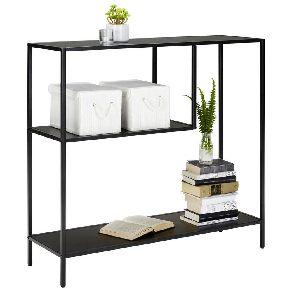 Táto polica v čiernej upúta pozornosť a ponúka praktický úložný priestor pre váš domov. Vďaka trendovému vzhľadu je polica ideálnou voľbou pre mnohé obytné priestory. Približne 100 x 96 x 33 cm (Š x V x H) veľká polica vyrobená z kovu  má 2 police vyrobené z melamínu. V otvorených priehradkách možno dekoratívne uložiť všetky druhy vecí.
