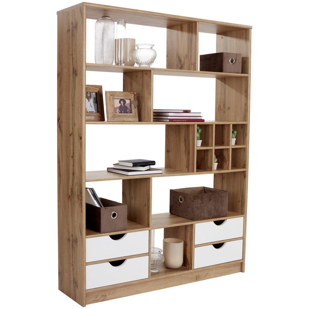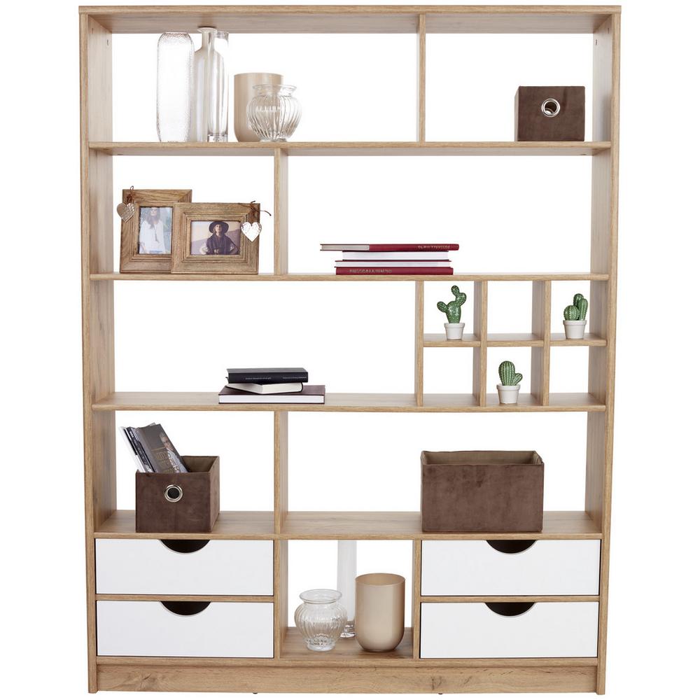 Tento štýlový regál / deliaca stena v dekore dub wotan so svojimi rozmermi cca 140 x 184 x 32 cm (Š/V/H) spĺňa vysoké nároky, pretože vďaka veľkým deviatim otvoreným priehradkám ponúka veľa úložného priestoru, ktorý je možné využiť rôznymi spôsobmi. Na dekorácie, rastliny, knihy a oveľa viac. Ďalšie miesto nájdete aj v štyroch bielych zásuvkách v spodnej časti regála. Módne, praktické a prehľadné. Doprajte si nový prehľad vo svojej domácnosti!