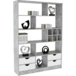 Tento štýlový regál / deliaca stena v betónovom dekore so svojimi rozmermi cca 140 x 184 x 32 cm (Š/V/H) spĺňa vysoké nároky, pretože vďaka veľkým deviatim otvoreným priehradkám ponúka veľa úložného priestoru, ktorý je možné využiť rôznymi spôsobmi. Na dekorácie, rastliny, knihy a oveľa viac. Ďalšie miesto nájdete aj v štyroch bielych zásuvkách v spodnej časti regála. Módne, praktické a prehľadné. Doprajte si nový prehľad vo svojej domácnosti!