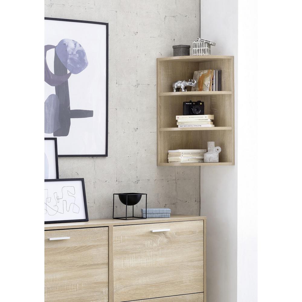 Tento výrobok je k dispozícii IBA ONLINE. Dodanie je zadarmo. Tento závesný rohový regál od značky CARRYHOME v drevenom dekore dub sonoma je vhodný na prezentáciu dekoratívnych predmetov, obľúbených zberateľských vecí alebo kníh. So svojimi rozmermi okolo 30 x 60 x 30 cm (Š x V x H) a tromi otvorenými priehradkami si určite nájde svoje miesto aj v tom najmenšom kúte obývačky, kancelárie či chodby – táto rohová polica je veľmi všestranná! Maximálna nosnosť je šesť kilogramov. Tento tovar je k dispozícii IBA ONLINE, a zároveň je to tovar s doručením formou DROPSHIPPING. Čo to pre Vás znamená? (DROPSHIPPING) – rýchlejšie doručenie – tovar ide priamo od dod&aacut