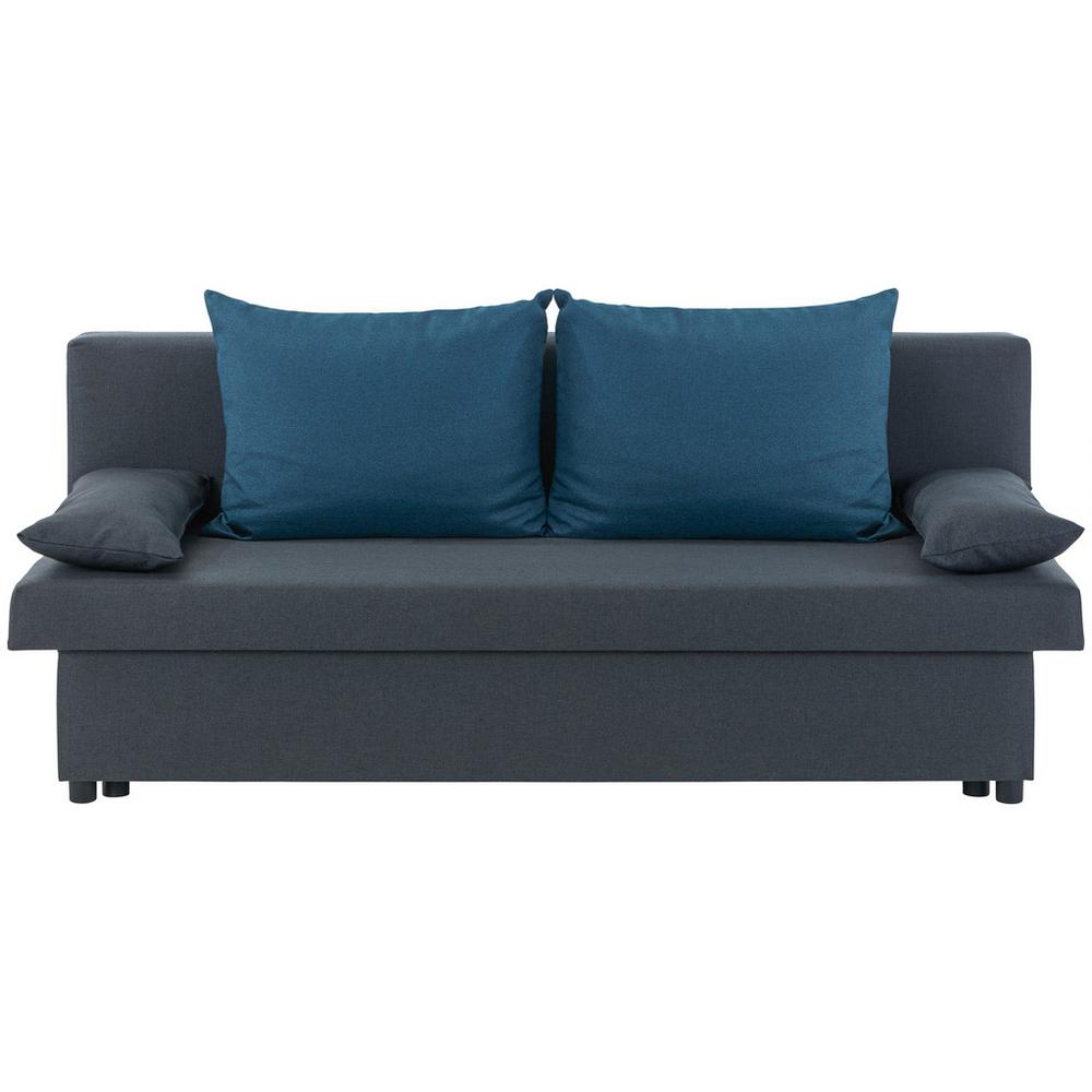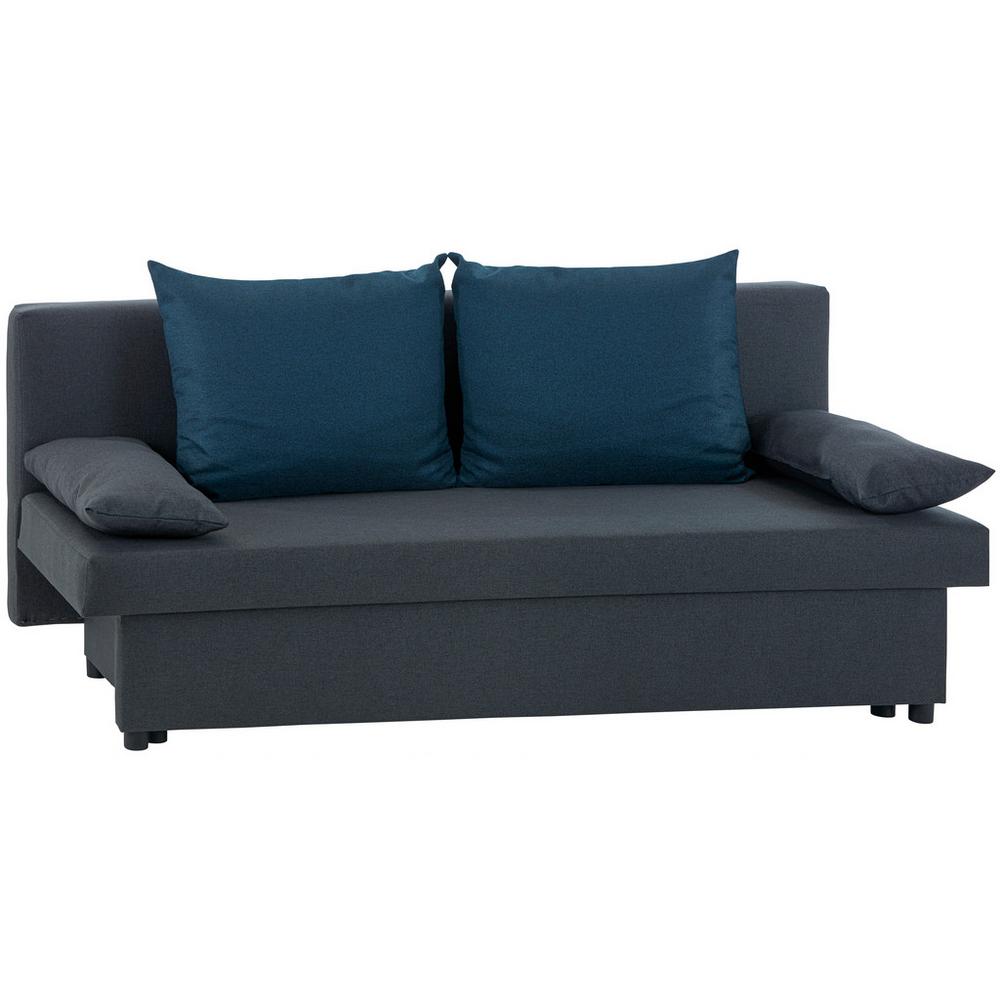 Rozkladacia pohovka NEO je ideálnym nábytkom aj do menších priestorov a ihneď zaujme svojím moderným a šikovným vzhľadom! Krásny sivý poťah vkusne dopĺňajú dva veľké, chrbtové vankúše tmavomodrej farby. K pohovke prináležia tiež dva malé, dekoratívne vankúše, ktoré sa dajú využiť ako lakťové opierky. Pohovka disponuje rozmermi cca 192 x 82 x 82 cm (Š x V x H), ktoré sú kompaktné, ale aj napriek tomu ponúkajú dostatok priestoru na odpočinok. Drevený rám, pružinové jadro a kvalitná pena v čalúnení vám zaručí maximálny komfort pri sedení aj ležaní. Pohovku totiž možno zmeniť na lôžko s plochou na spanie približne 192 x 135 cm. Do úložného boxu pod sedacou plochou sa bez problémov zmestia lôžkoviny alebo iné, dočasne nepotrebné veci. Elegantná pohovka NEO je výrazným a užitočným prvkom v mnohých domácnostiach! Pozrite si v našom eshope ďalšie