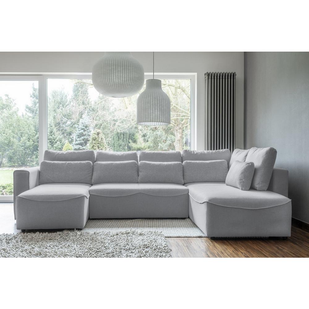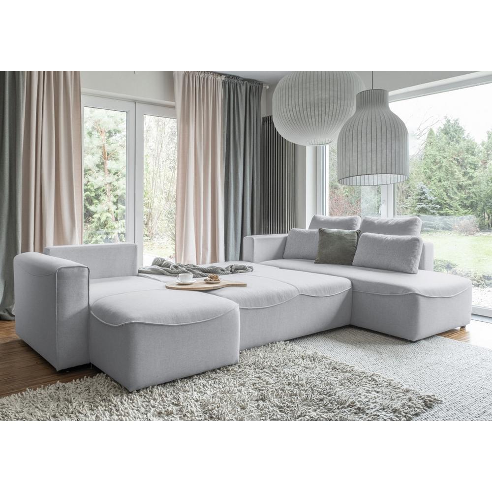 Tento výrobok je k dispozícii iba ONLINE. Pohodlie, útulnosť, harmónia, relax – aj tak sa dá popísať táto skvelá sedacia súprava. Už na prvý pohľad ulahodí oku jej nadýchaný vzhľad s množstvom vankúšov a jej svetlosivý odtieň. Rohová sedačka THOMAS má kvalitný prešívaný poťah, testovaný so 100 000 testovacími cyklami voči oderu, čo prispieva k ešte väčšej atraktívnosti nábytku. S rozmermi približne 331 x 93 x 210 cm (Š x V x H) ponúka sedačka komfortnú plochu na sedenie v tvare U, pre asi osem ľudí. Obojstranne montovateľné otomany a originálny zadný poťah umožňujú flexibilné zostavenie sedačky podľa predstáv, a následné umiestnenie podľa individuálnych potrieb. Sedadlo, ktoré je vysoké asi 43 cm, obsahuje polyetherové penové jadro a vlnité pružiny, ktoré sa postarajú o komfortné sedenie a oddych. K celkovému pohodliu prispievajú lakťové opierky, veľké chrbtové vankúše, a menšie, bedrové vankúšiky. Sedačka má tiež funkciu spánku: Zadné operadlo je možné sklopiť a lavicu vysunúť dopredu – tak vznikne lôžko s plochou na ležanie s rozmermi asi 150 x 293 cm. Takže na nej môžete spať, relaxovať alebo ubytovať hostí. Na odloženie van