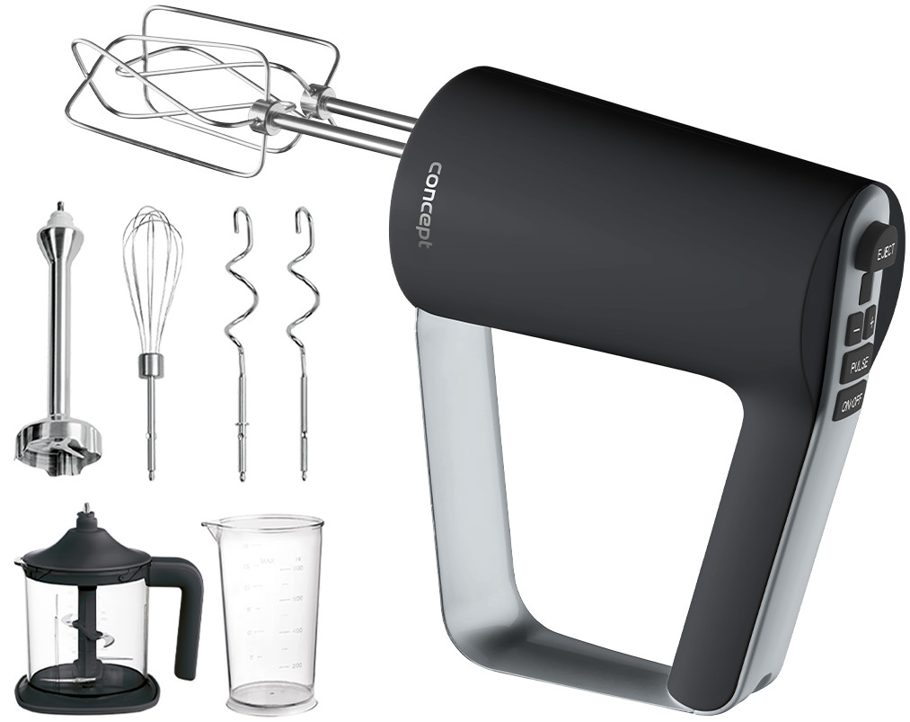 Ručný šľahač CONCEPT SR 3310 ponúka 5 rýchlostí a funkciu Pulse pre krátkodobé dosiahnutie maximálneho výkonu. Obsluha šľahača je jednoduchá a vďaka ergonomickému tvaru zaisťuje pohodlnú prácu. Do jeho výbavy patria nerezové šľahacie metly, hnetacie háky, ponorný mixovací nástavec a chopper. Nerezové šľahacie metly sú ideálne na šľahanie peny, prípravu krémov alebo riedkych ciest na palacinky a omelety. Špeciálnu šľahaciu metlu využijete na šľahanie šľahačky alebo snehu z bielkov. Hnetacie háky si poradia s ťažšími cestami. Ponorný mixér vyšľahá vaše polievky a omáčky do krémových konzistencií. Mixovací nástavec je vyrobený z nerezovej ocele, ktorá je odolná voči vysokým teplotám, preto môžete pokrmy mixovať priamo v hrnci. Je skvelý na prípravu majonéz, kokteilov a detských výživ. Chopper využíva na prácu dvoch párov ostrých sekacích nožov. Dôkladne rozseká mäso, syry, zeleninu, ovocie, bylinky alebo orechy. K príslušenstvu patrí aj praktická mixovacia nádoba s objemom 800 ml. Prístroj je vybavený bezpečnostnou poistkou, ktorá bráni prehriatiu motora. Šľahacie metly a hnetacie háky vyberiete z prístroja jednoduchým stlačením tlačidla na tele prístroja. Metly a háky umývajte ručne alebo v umývačke.Dokonalý kuchynský pomocníkJednoduchá obsluha5 rýchlostíTlačidlo PULSEErgonomický dizajnTlačidlo na vybratie metličiek hákovBezpečnostná poistkaPríkon: 500 WNapätie: 220 – 240 V ~ 50/60 Hz Príslušenstvo:2 nerezové šľahacie metly2 nerezové hnetacie háky1 nerezová šľahacia metla1 nerezový mixovací nástavecMixovacia nádoba (800 ml)Sekacia nádoba
