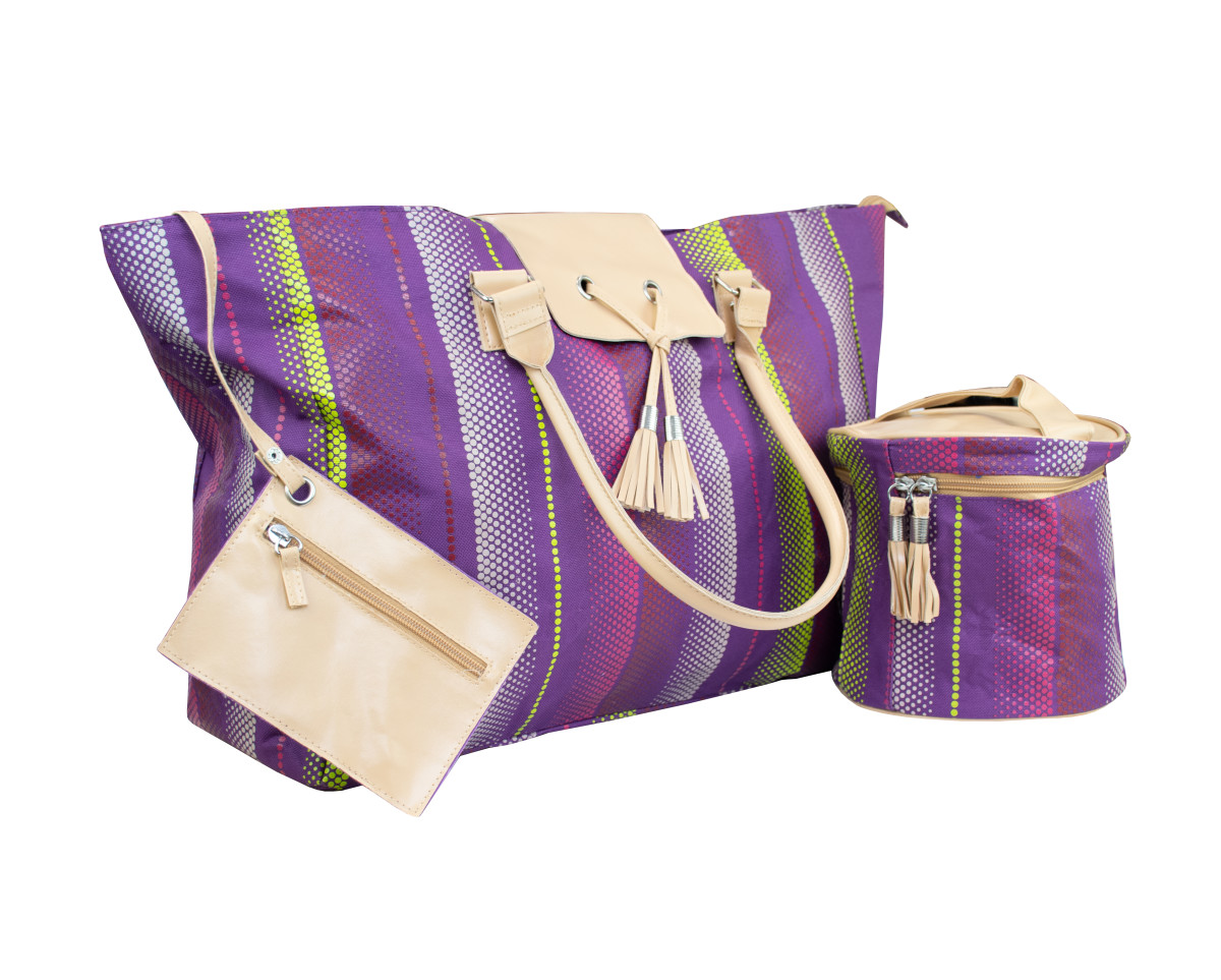 Pre cestovanie je sada kabeliek ako stvorená. Skladá sa z 3 dielov: veľká taška na cesty so zipsovým zatváraním (rozmery: šírka 58,5 cm, výška 32 cm, hĺbka 16,5 cm), malé pripnuté vrecko so zatváraním na zips (12 x 15,5 cm) a guľatá kabelka valcového tvaru so zipsovým zatváraním a úchytom (priemer 17,5 cm, výška 17 cm). Materiál: 90% polyester, 10% PVC.Ideálna sada na cestyUmývateľný povrch