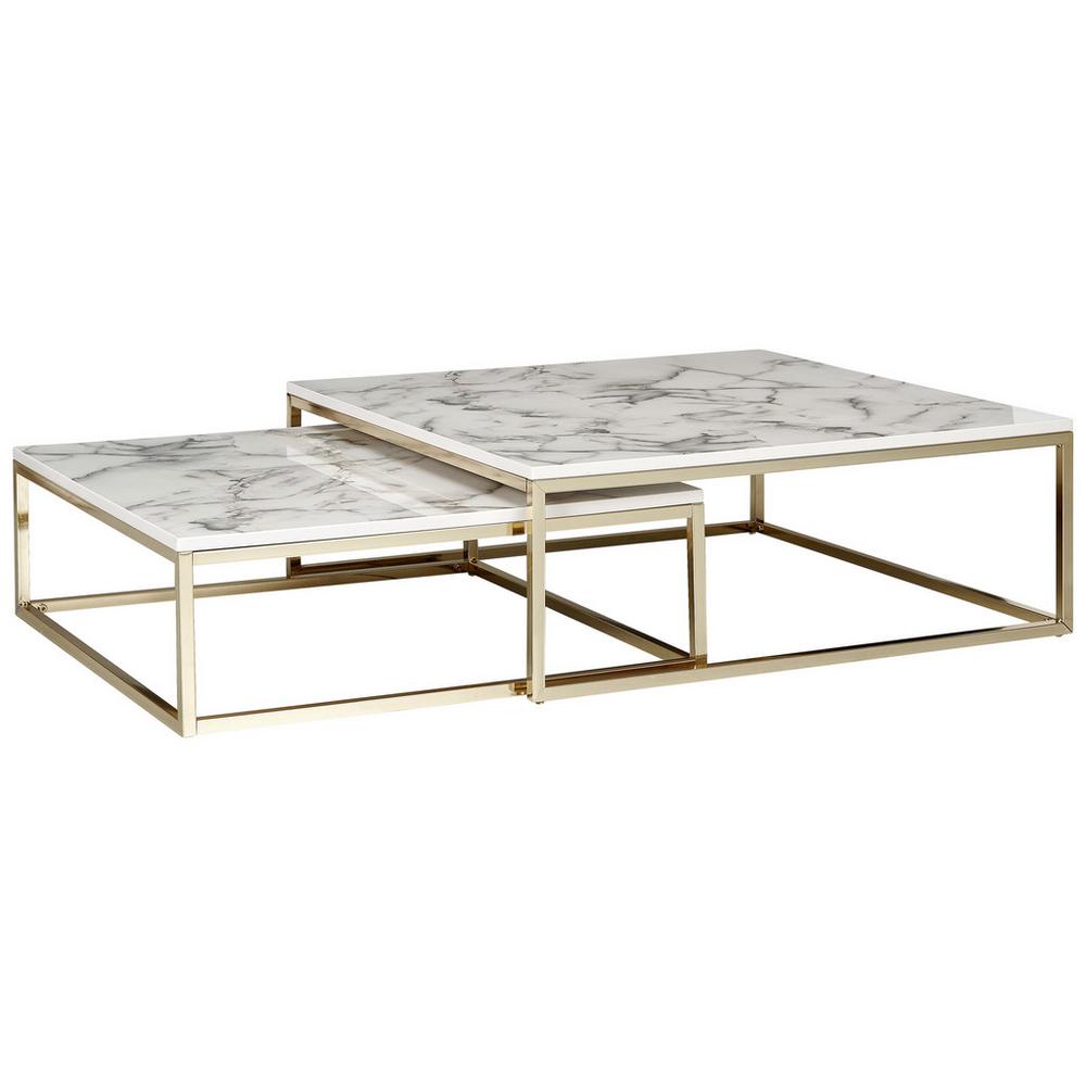 Tento výrobok je k dispozícii IBA ONLINE. Dodanie je zadarmo. S touto zaujímavou súpravou dvoch konferenčných stolíkov môžete svoju obývačku premeniť v niečo špeciálne. Stolíky zaujmú pevným rámom z lakovanej ocele v zlatej farbe a elegantnou štvorcovou doskou, vyrobenou z MDF vo vzhľade bieleho mramoru. Väčší stolík meria približne 75 x 27 x 75 cm (Š x V x H), menší asi 65 x 22 x 65 cm (Š x V x H). Vďaka týmto mierne odlišným rozmerom môžete stoly zasunúť pod seba a vytvoriť tak originálny celok, ale tiež ich možno využiť aj jednotlivo. Či už ide o príjemný večer pri televízii alebo o posedenie s hosťami – stolíky ponúkajú optimálne miesto na občerstvenie či dekorácie. Dosky s hrúbkou približne 15 mm je možné zaťažiť max. do 8 kg. Tento tovar je k dispozícii IBA ONLINE, a zároveň je to tovar s doručením formou DROPSHIPPING. Čo to pre Vás znamená? (DROPSHIPPING)