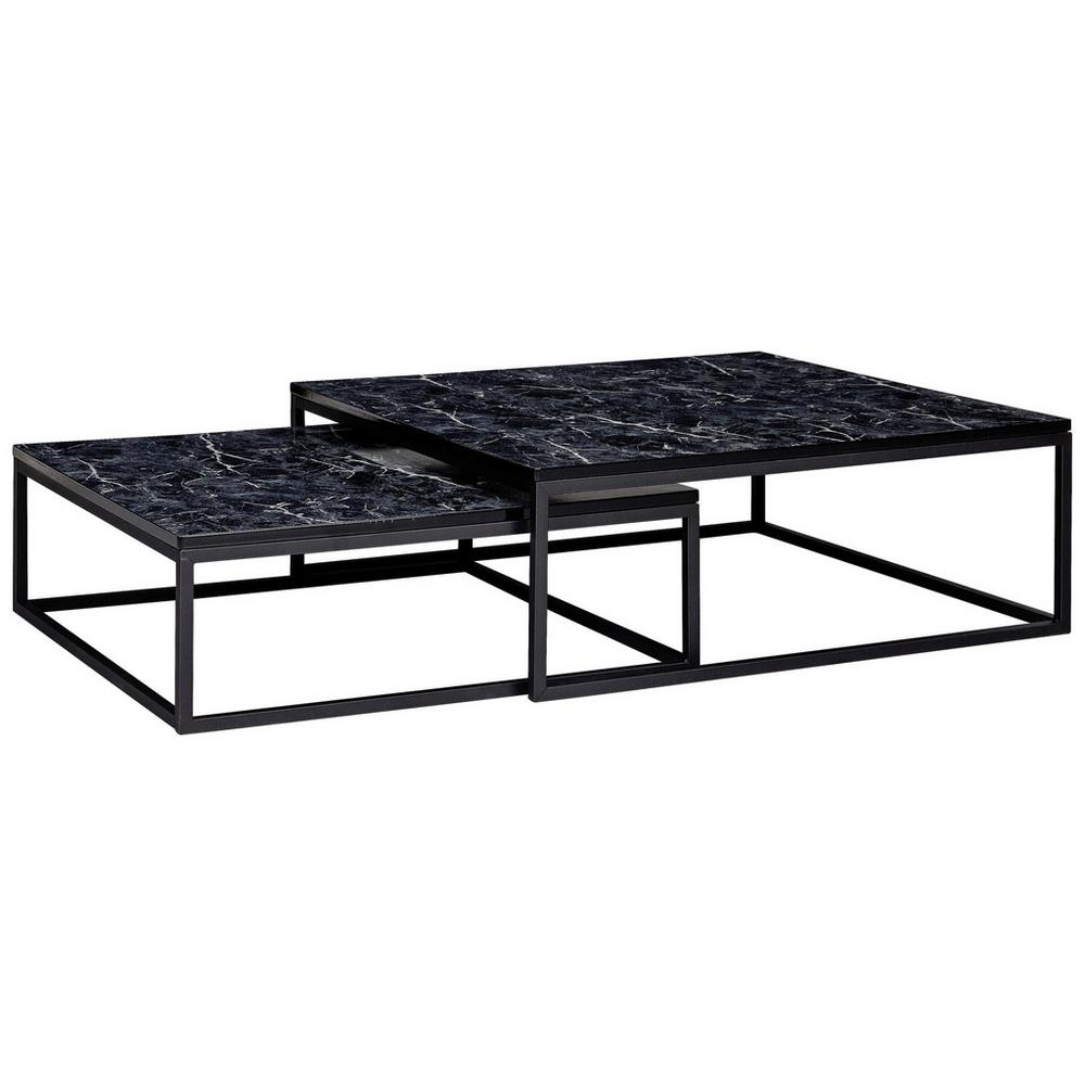 Tento výrobok je k dispozícii IBA ONLINE. Dodanie je zadarmo. S touto zaujímavou súpravou dvoch konferenčných stolíkov môžete svoju obývačku premeniť v niečo špeciálne. Stolíky zaujmú pevným rámom z čiernej lakovanej ocele a elegantnou štvorcovou doskou, vyrobenou z MDF vo vzhľade tmavého mramoru. Väčší stolík meria približne 75 x 27 x 75 cm (Š x V x H), menší asi 65 x 22 x 65 cm (Š x V x H). Vďaka týmto mierne odlišným rozmerom môžete stoly zasunúť pod seba a vytvoriť tak originálny celok, ale tiež ich je možné využiť aj jednotlivo. Či už ide o príjemný večer pri televízii alebo o posedenie s hosťami – stolíky ponúkajú optimálne miesto pre občerstvenie či dekorácie. Dosky s hrúbkou približne 15 mm je možné zaťažiť max. do 8 kg. Tento tovar je k dispozícii IBA ONLINE, a zároveň je to tovar s doručením formou DROPSHIPPING. Čo to pre Vás znamená? (DROPSHIPPING)