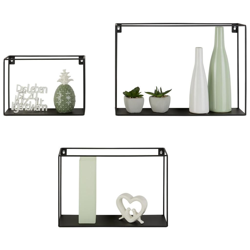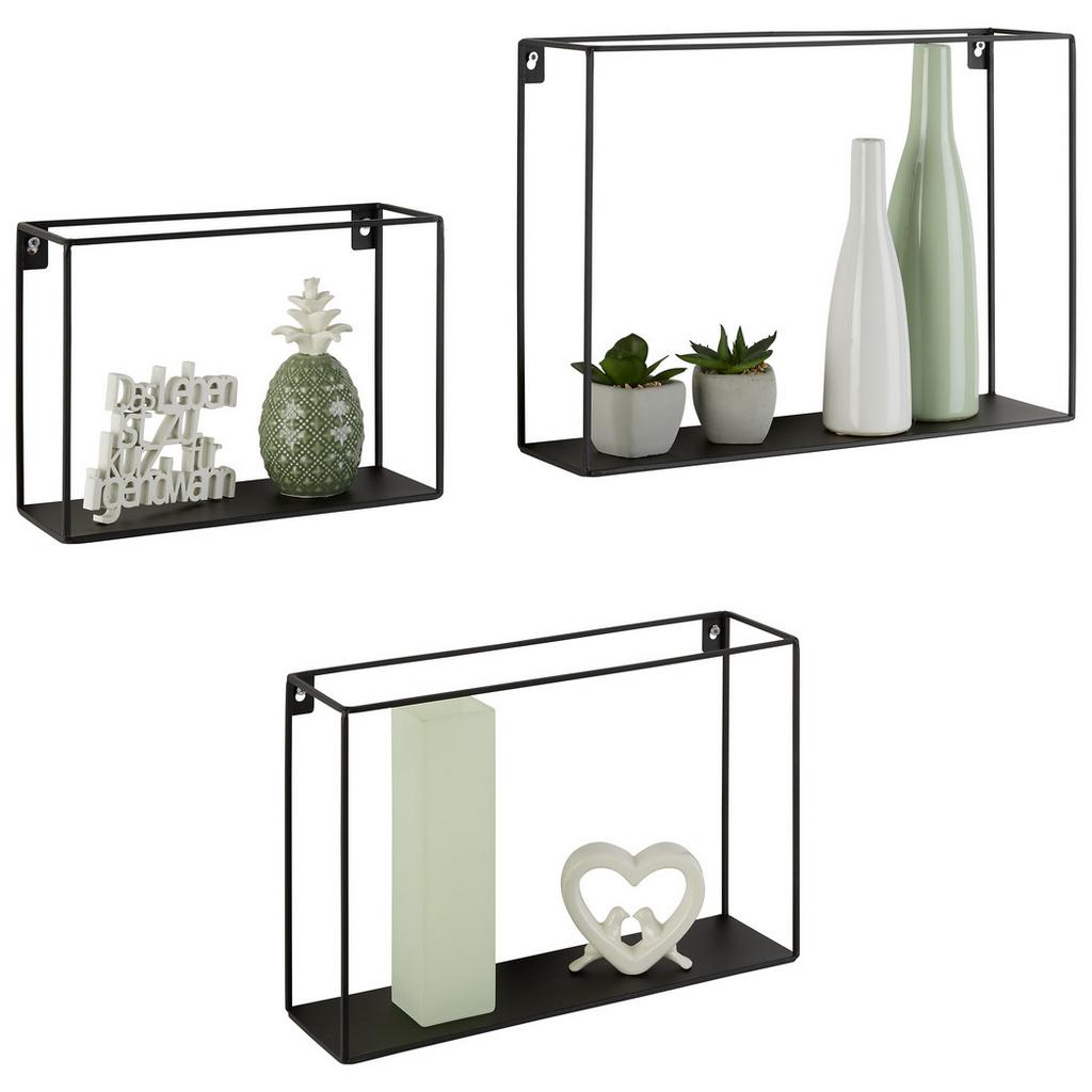 Táto trojdielna sada nástenných políc v čiernej farbe je štýlovým a praktickým doplnkom do každého domova. Kovové poličky v tvare klietok bodujú svojím vzhľadom a dajú sa ľahko pripevniť k stene. Ponúkajú priestor pre individuálny dizajn vystavovaných predmetov a hodia sa do mnohých obytných miestností. Police majú nasledovné približné rozmery (Š/V/H): 40 x 28 x 10 cm 35 x 24 x 10 cm 25 x 18 x 10 cm