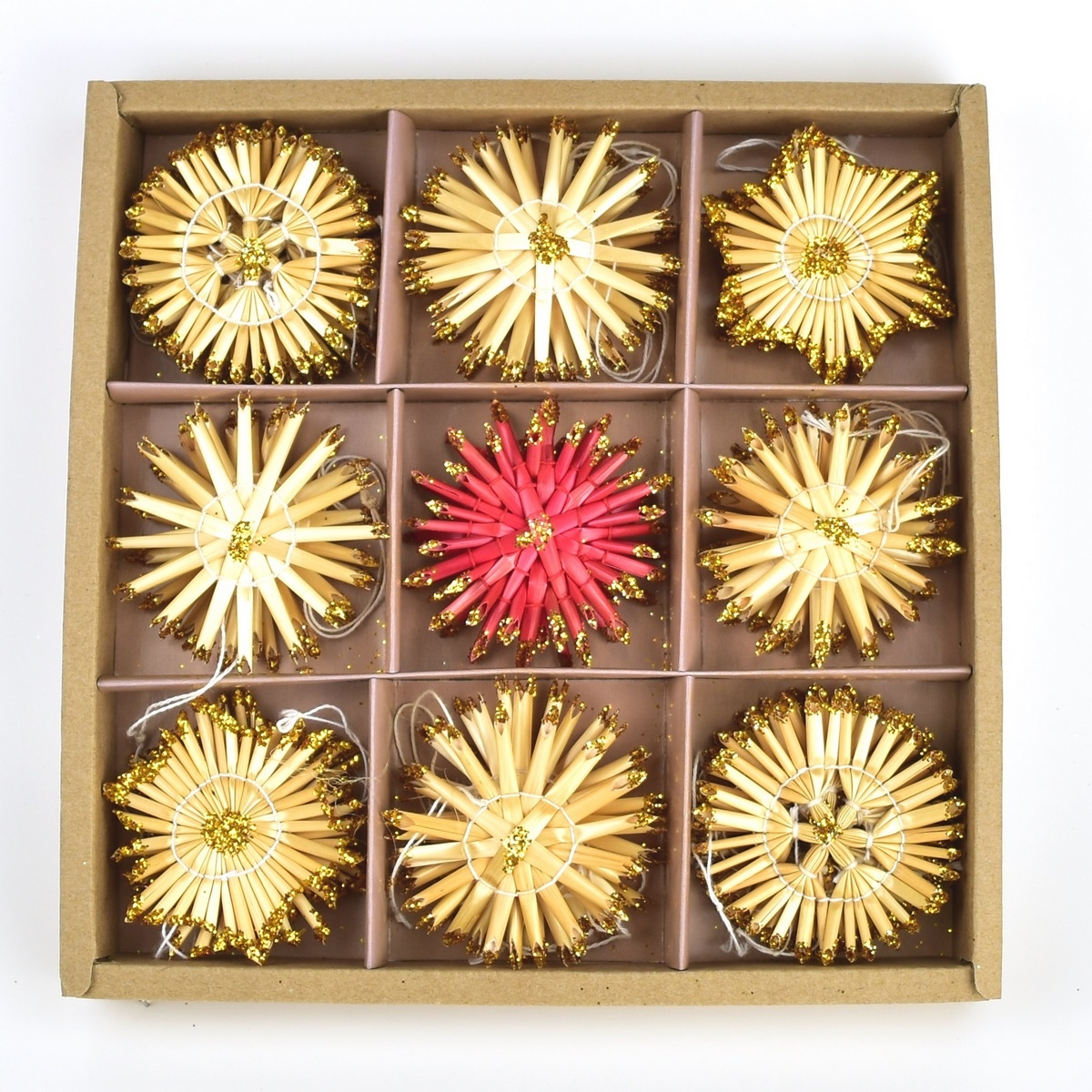 Sada ručne vyrábaných slamených ozdôb obsahuje tri druhy prírodných slamených vločiek a jeden druh červených vločiek. Vločky majú pozlátené okraje. Ozdoby sú viazané bielou a červenou niťou, všetky majú pútko na zavesenie. Veľkosť jednej ozdoby je cca 6 x 6 cm.