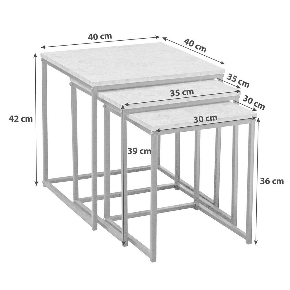 3-dielna sada odkladacích stolíkov je vďaka šikovnému dizajnu fantastickým doplnkom do modernej domácnosti. Sada sa dá taktiež využiť ako originálny konferenčný stolík do obývacej izby. Odkladacie stolíky pozostávajú z dosky v dekore betón a z decentného podstavcu z čierneho kovu. Či už jednotlivo alebo ako sada – odkladacie stolíky ROCK dodajú každej obývacej izbe trendový ráz! Rozmery: stolík 1 (š/v/h): 40 x 42 x 40 cm stolík 2 (š/v/h): 35 x 39 x 35 cm stolík 3 (š/v/h): 30 x 36 x 30 cm
