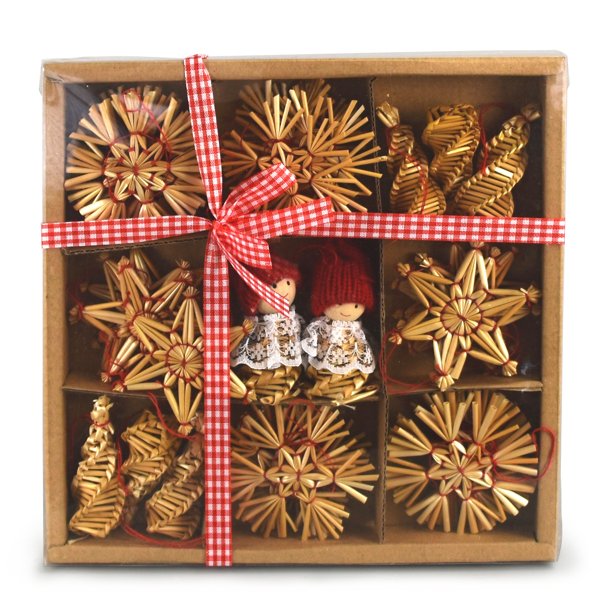 Sada tradične vyrábaných slamených ozdôb vám pomôže k štýlovej vianočnej výzdobe interiéru. Ozdoby vyniknú na vianočnom stromčeku aj na iných prízdobách. Sada obsahuje 38 ks ozdôb rôznych tvarov, vrátane 2 ks roztomilých bábik. Veľkosť …