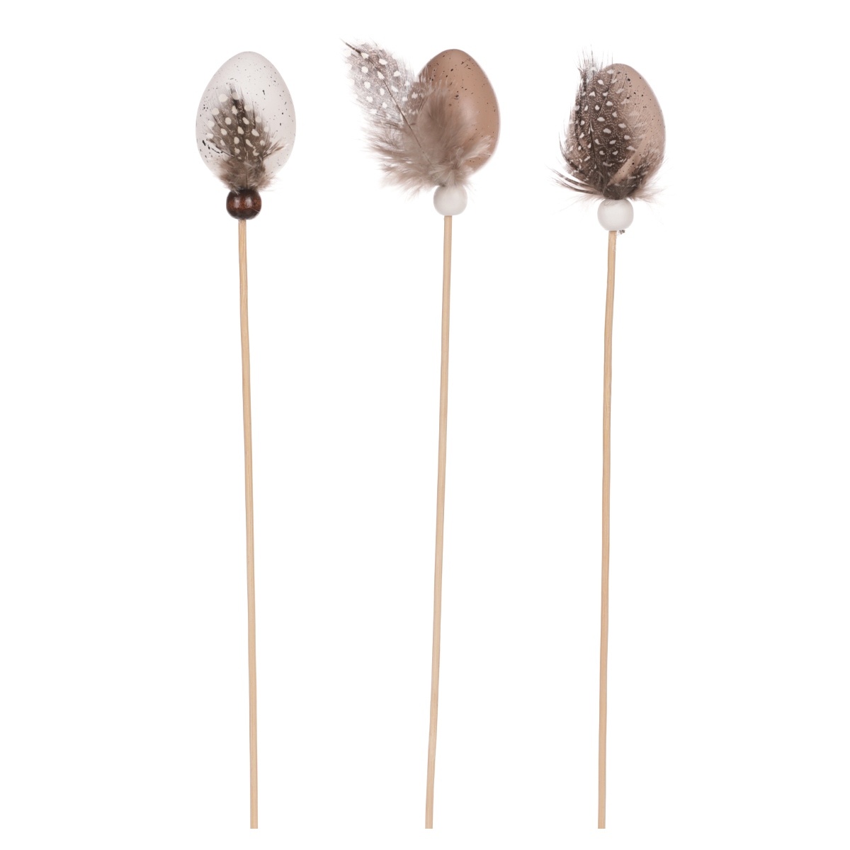 Sada 6 ks zápichov s plastovými vajíčkami na veľkonočnú výzdobu. Každé vajíčko je doplnené pierkom, korálkou. Balenie obsahuje 6 ks zápichov v troch farebných odtieňoch, vždy po 2 ks od farby.