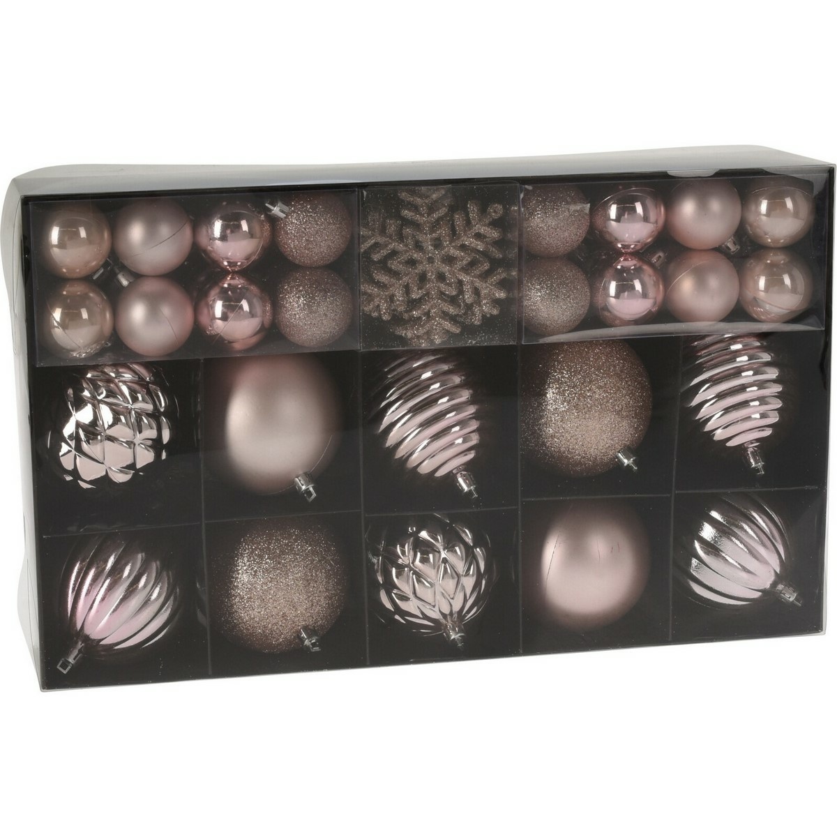 Máte radi vianočný stromček zladený do jednej farby? V tejto sade nájdete guľôčky s lesklým, matným a trblietavým povrchom v rôznych veľkostiach a ozdoby v tvare vločiek. Váš stromček tak bude vyzerať elegantne. Kvalitné plastové prevedenie zaistí dlhú životnosť, vďaka čomu vám budú skvele slúžiť po mnoho rokov. Obsah sady: