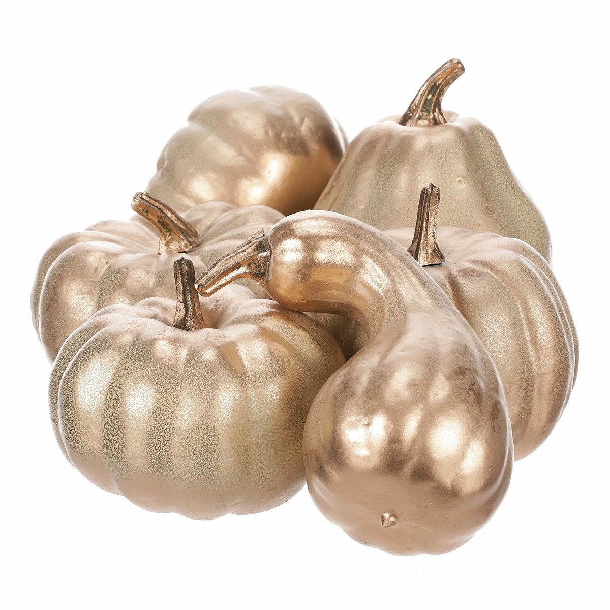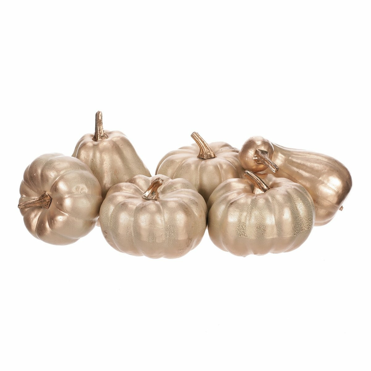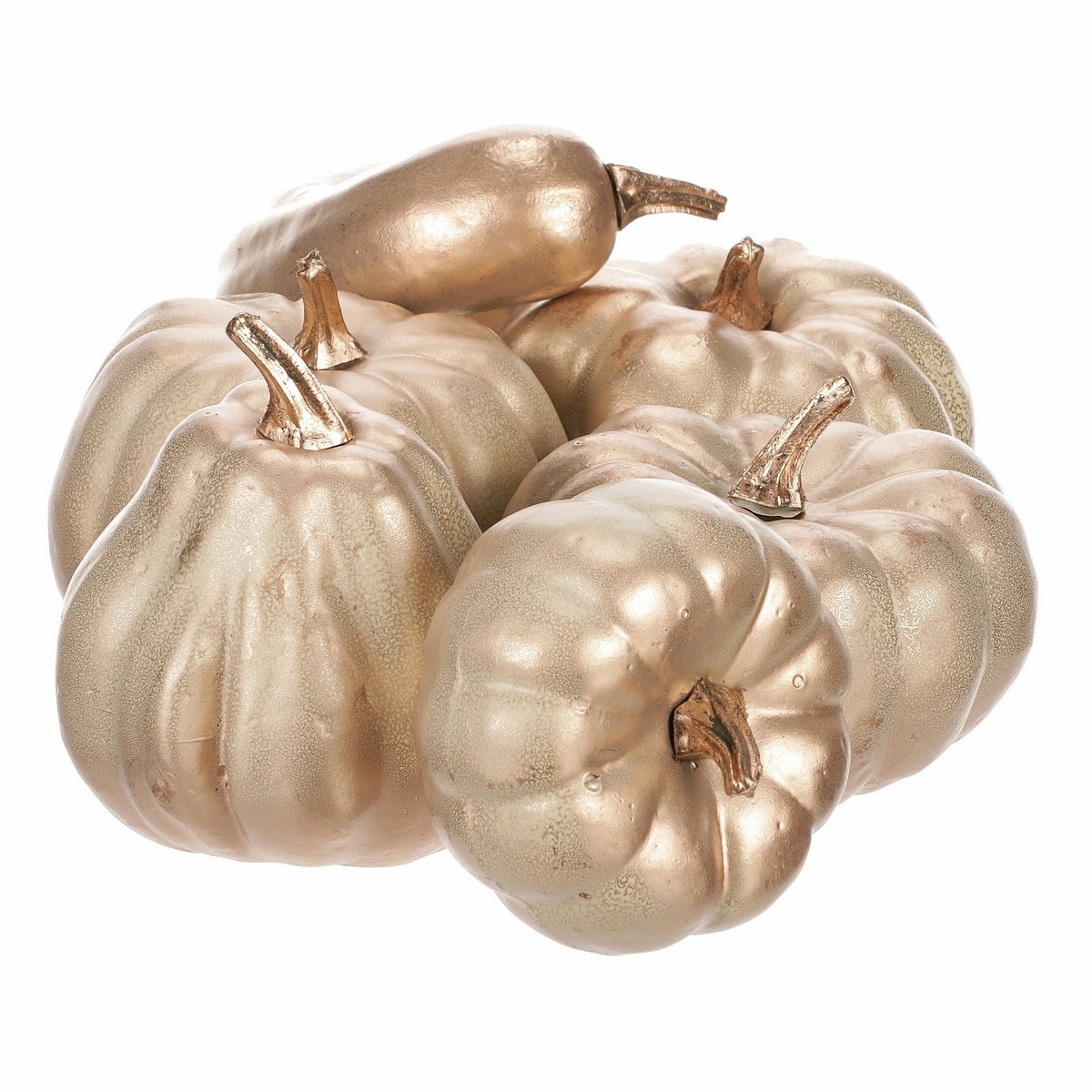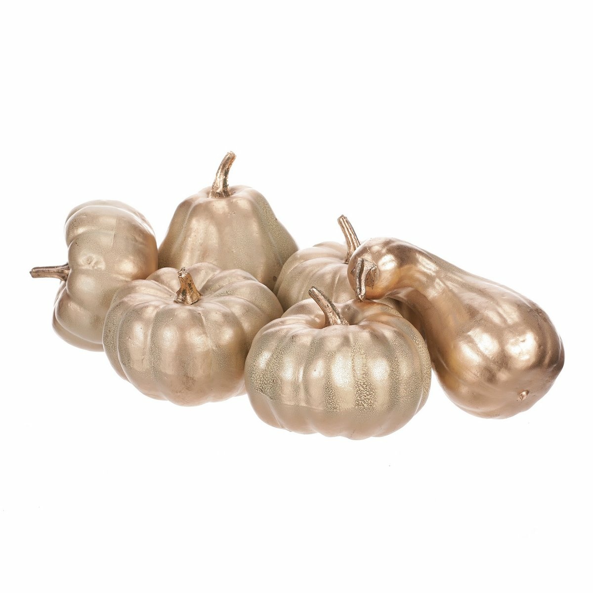 Plastové tekvičky jemnej zlatistej farby vkusne doplnia vašu jesennú výzdobu. V sade je šesť kusov rôzne tvarovaných tekvičiek. Vyrobené sú z odolného plastu, takže vám vydržia aj niekoľko rokov. Sú vhodné aj na vonkajšie použitie.Rozmery tekvičiek: pr. 9 x v. 8,3 cm, pr. 9,3 cm x v. 7 cm, pr. 8 cm x v. 9,8 cm, pr. 8 cm x v. 6,4 cm