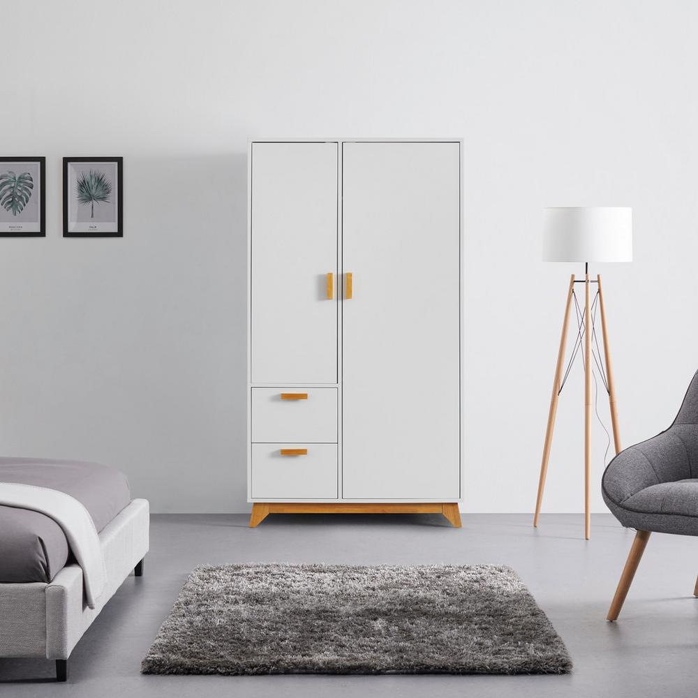 Tento výrobok je k dispozícii iba ONLINE. Táto šatníková skriňa vhodná do detskej izby v bielej a svetlohnedej farbe je dekoratívnym aj praktickým doplnkom pre mnohé obytné priestory. Je vyrobená z MDF a vďaka melamínovému povrchu sa ľahko udržiava. Drevené nohy a rukoväte vo svetlohnedej farbe dotvárajú atraktívny vzhľad. Praktické vybavenie skrine tvorí 7 nastaviteľných políc a 1 šatníková tyč za 2 pántovými dverami a dve zásuvky. Doplňtesi tento nábytok aj o ostatné kúsky zo série MILAN a vytvorte si v príbytku celok s originálnym štýlom! <