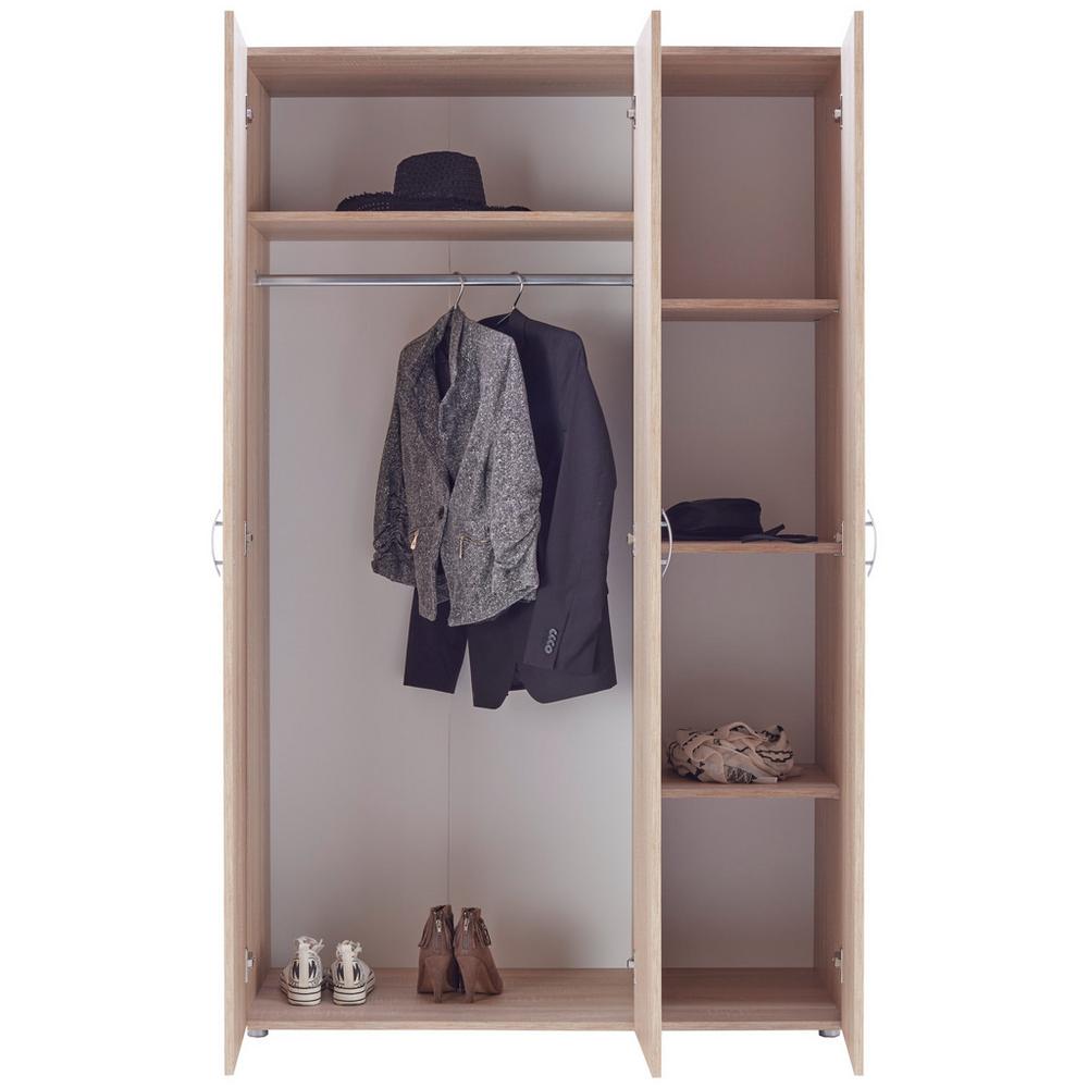 Niet pochýb o tom, že šatníková skriňa je súčasťou základného vybavenia každej domácnosti. S BASIC 3 si vyberiete kompaktný, dobre premyslený priestor v pokojnom, nadčasovom dizajne.Skriňa v dekore dub Sonoma má rozmery cca110,7 x 179 x 51,6 cm (Š x V x H). Pracovné oblečenie, sukne a obľúbené blúzky sa dajú úhľadne a bez pokrčenia zavesiť na tyč na šaty. Pevne nainštalovaná polica boduje ako hotová zásoba pre košele, svetre, spodnú bielizeň atď.Šedé plastové rukoväte završujú jednoduchý dizajn. Pri použití tejto šatníkovej skrine využite výhody technológie otočných dverí, ktoré šetria miesto a umožňujú otváranie oboch dverí súčasne aj v malých miestnostiach.BASIC zapôsobí ako upratané a útulné riešenie v mnohých štýloch zariadenia.
