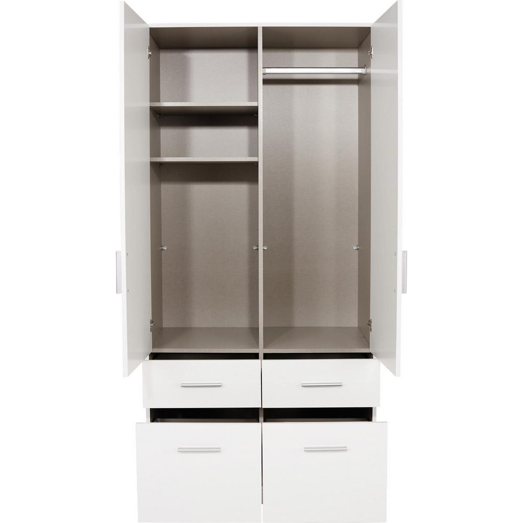 Kladiete veľký dôraz pri zariaďovaní spálne na funkčnosť a atraktívny vzhľad zároveň? Potom je skriňa Celle pre vás ideálnou voľbou! Dvojdverová skriňa ponúka štyri priestranné zásuvky umiestnené pod dverami. Vnútro skrine ukrýva jednu šatníkovú tyč na zavesenie oblečenia. Dva hĺbkové typy zásuviek ponúkajú možnosť ukladania a organizovania veľkého množstva malého oblečenia a bielizne. Boky skrine sú zhotovené v matnej a čelo skrine vo vysokom lesku bielej farby. Praktická, priestranná, krásna, elegantná a lacná – či už do detskej / mládežníckej alebo do vašej spálne, táto skriňa vás určite presvedčí o jej kvalitách! Doplňte si túto skriňu aj nasledovným: 0380008516 nadstavec / doplnková skrinka Upozornenie: Horná doska skrine je bez povrchovej úpravy, nie je olaminovaná.