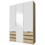 Skriňa v modernej kombinácii dekorov biela a prírodný dub disponuje tromi otočnými dverami. Stredné dvere sú vyhotovené so zrkadlovým povrchom. Dvere disponujú kovovými lištovými úchytmi vo farbe chrómu. Za dverami sa nachádzajú 2 police a 2 šatníkové tyče. Rozmery skrine cca 150 x 236 x 58 cm (Š/V/H) umožňujú bez problémov uskladniť všetky potrebné veci a oblečenie. Zariaďte si svoj domov moderne! Skriňu je možné kombinovať s inými skriňami zo série LEVER. Poznámka: Certifikovaný nemecký výrobok.