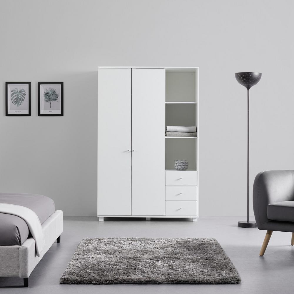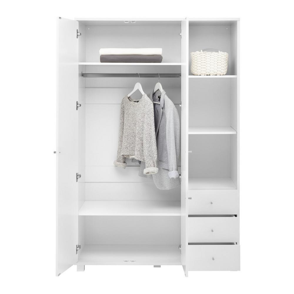 Tento tovar je k dispozícií IBA ONLINE. Šatník MILO v bielej farbe s nadčasovou eleganciou a rovnými líniami. Poskytuje optimálny priestor pre Vaše odevy a môže byť kombinovaný s mnohými štýlmi. Skriňa z MDF a pravého dreva má 2 otočné dvere s tlmením dverí a systémom mäkkého zatvárania, 1 koľajničku na prádlo, 5 políc, z ktorých 1 je nastaviteľná a 3 zásuvky s pohodlným výsuvom. 3 otvorené priehradky vám poskytujú veľa priestoru pre dekorácie. Vďaka melamínovému povlaku je povrch odolný voči poškriabaniu a ľahko sa udržuje. Gombíky z kovu v striebornej farbe harmonicky dotvárajú vzhľad.