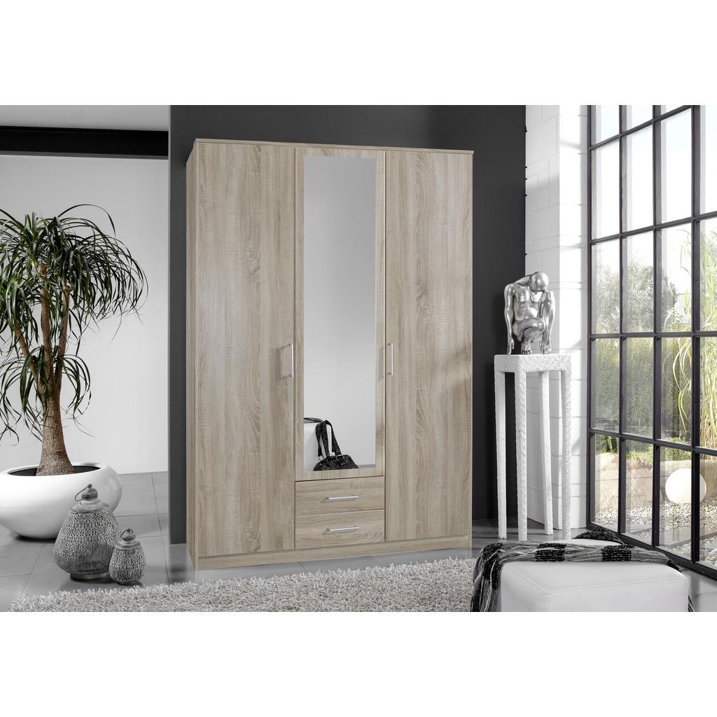 Tento výrobok je k dispozícii iba ONLINE. Potrebujete viac miesta na svoje oblečenie? So štýlovou skriňou OSAKA získajú aj vášniví fanúšikovia módy dostatok priestoru pre svoj rozsiahly šatník. Priestorovo aj vizuálne atraktívna šatníková skriňa je vyhotovená s dubovým dekorom, ktorý dopĺňajú rukoväte v hliníkovej farbe. Inteligentné usporiadanie interiéru je zamerané na čo najväčší prehľad. Za tromi otočnými dverami sa nachádzajú dve šatníkové tyče a dve police, ktoré si môžete flexibilne prispôsobiť a výškovo nastaviť tak, ako potrebujete. Ďalším prvkom sú dve zásuvky, ktoré poskytujú veľa miesta navyše. Stredné dvere sú naviac vybavené zrkadlom, takže si môžete ihneď na sebe skontrolovať zvolenú kombináciu odevov. Praktická, estetická a priestranná. Skriňa, ktorá vás nadchne vo všetkých smeroch!