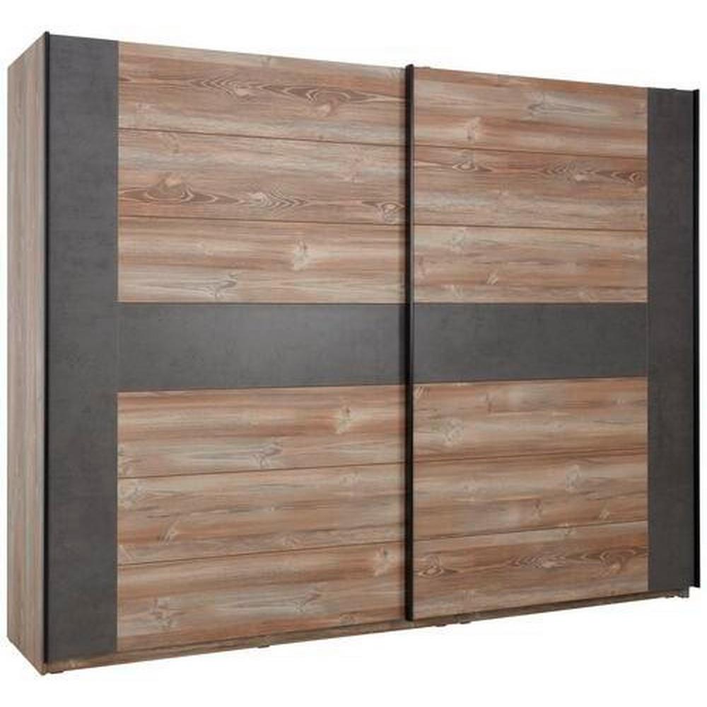 Vynikajúci vzhľad a štýlová elegancia – to všetko prináša táto skriňa, ktorú si obľúbite vo vašej spálni. Kombinácia tmavých farieb dekorov píniovej borovice a imitácie tmavého betónu dodáva šatníku s rozmermi cca 221 x 210 x 62 cm (Š/V/H) obzvlášť exkluzívny vzhľad. Lištové úchyty pozdĺž dverí v čiernej farbe zdôrazňujú módny vzhľad. Vďaka dvom posuvným dverám môže byť šatník nastavený tak, aby šetril miesto. Vďaka 2 vkladacím policiam a 2 šatníkovým tyčiacm ponúka veľa priestoru pre odevy a i né textílie.
