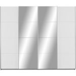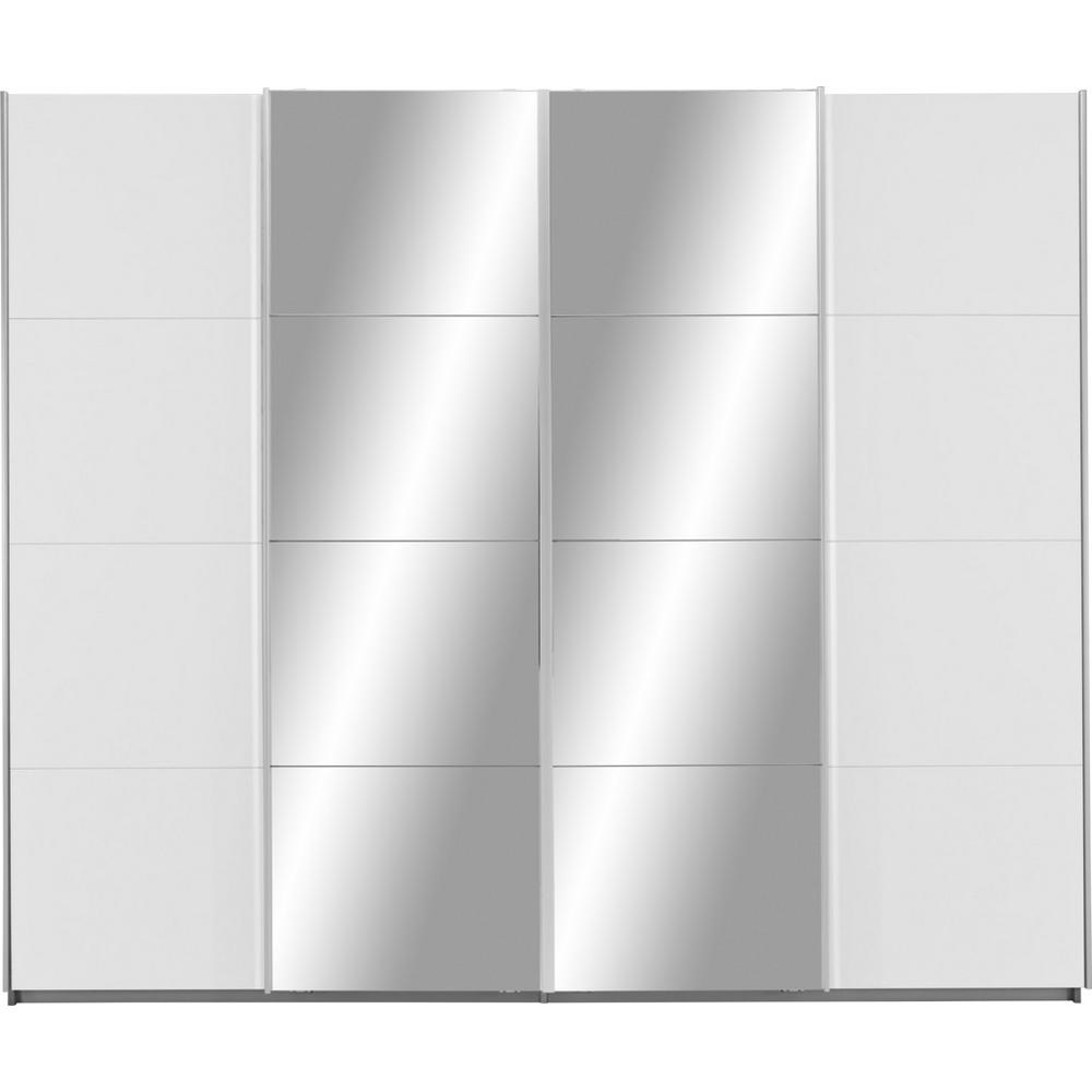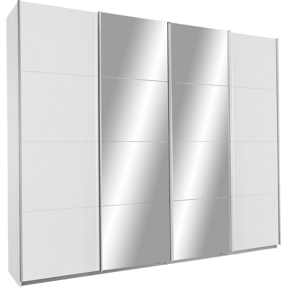 Táto moderná šatníková skriňa značky JAMES WOOD vyhotovená v alpskej bielej farbe dokonale zapadne do každej modernej spálne. Atraktívnym a výrazným prvkom sú dve zrkadlové dvere so synchronizovaným otváraním, čím ukazujú vynikajúci prehľad vášho šatníka. Perfektný dizajn dopĺňajú lištové úchyty vo farbe chrómu. So skriňou veľkosti 271 x 230 x 62 cm (Š/V/H) získate za 4 posuvnými dverami dostatok úložného priestoru a veľmi rozmanité možnosti ukladania. K dispozícii sú 4 šatníkové tyče a 8 nastaviteľných vkladacích políc, ktoré umiestnite do skrine podľa vašich predstáv a požiadaviek. S touto skriňou získate dostatok priestoru na oblečenie, posteľnú bielizeň a na všetky ostatné veci, ktoré chcete uskladniť. Užite si priestranný šatník v modernom dizajne! Poznámka: Certifikovaný nemecký výrobok. Upozornenie: Tento výrobok je dostupný len na objednávku v našom e-shope alebo kamenných predajniach. Horná doska skrine je bez povrchovej úpravy, nie je olaminovaná.