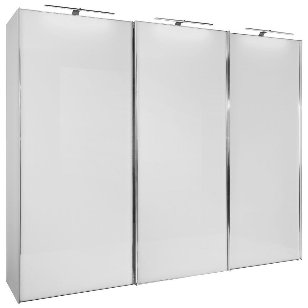 Táto moderná šatníková skriňa v korpuse vyhotovenom v bielom dekore a so sklenenými dverami v alpskej bielej prináša do spálne funkčnosť a elegantný vzhľad. Kovové úchyty vo farbe chrómu zaokrúhľujú celkový obraz vo veľkom štýle. Šatník s rozmermi cca 298 x 240 x 68 cm (Š/V/H) je vybavený 3 posuvnými dverami, za ktorými sa nachádza 1 šatníková tyč a 6 nastaviteľných vkladacích políc. Táto veľmi kvalitná skriňa sa hodí do každej modernej spálne. Osvetlenie, rozdeľovník vnútorného členenia v tvare T a zásuvkový modul nie sú súčasťou dodávky. Využite bohatý výber doplnkov a variantov (výber dekorov a rozmerov) pre túto skriňu! Poznámka: Certifikovaný nemecký výrobok. Upozornenie: Dostupné len na objednávku v našich predajniach alebo cez e-shop.