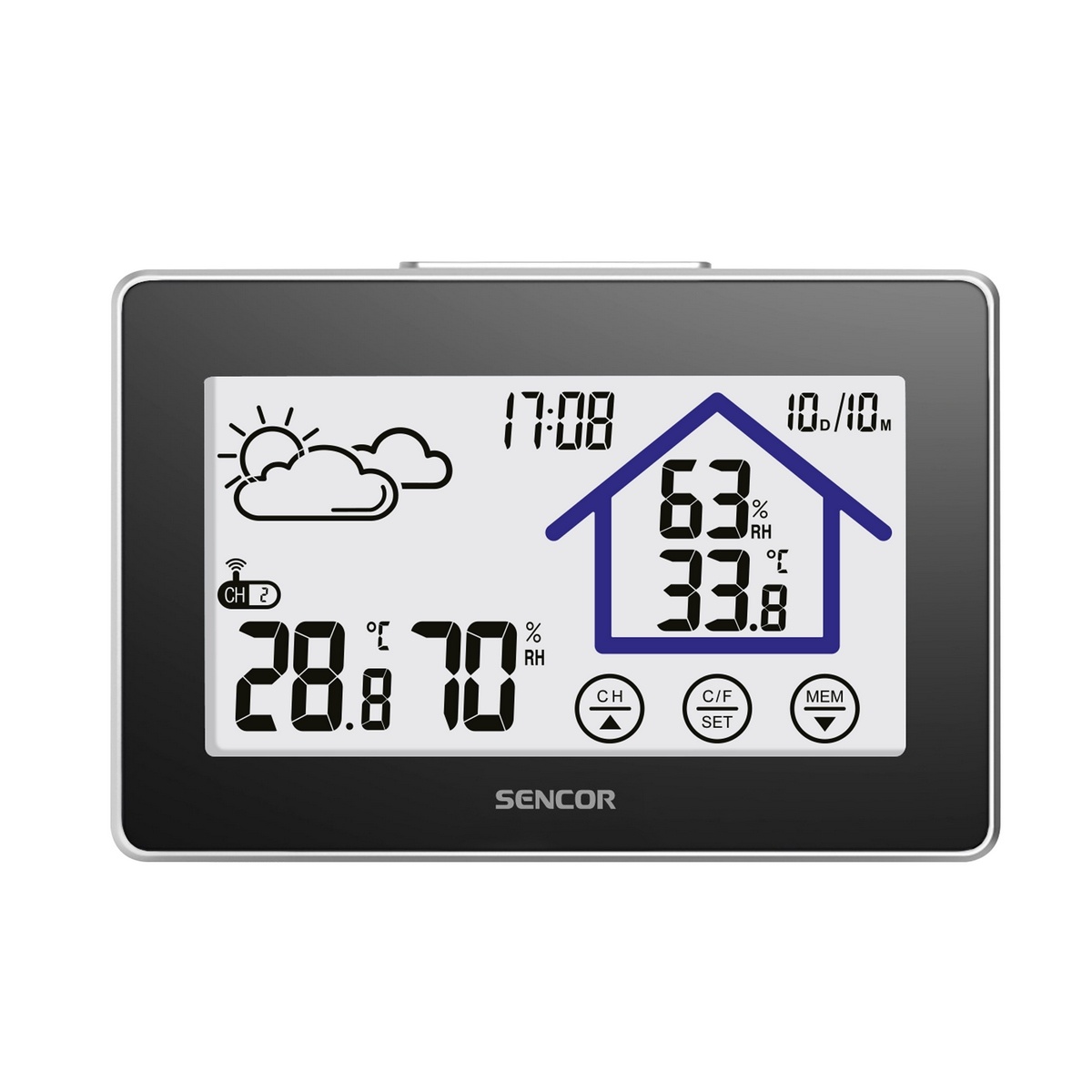 Digitálna meteostanica s bezdrôtovým senzorom meria vnútornú aj vonkajšiu teplotu a vlhkosť. Predpoveď počasia sa zobrazuje pomocou symbolov na veľkom LCD displeji s krátkodobým bielym podsvietením.