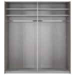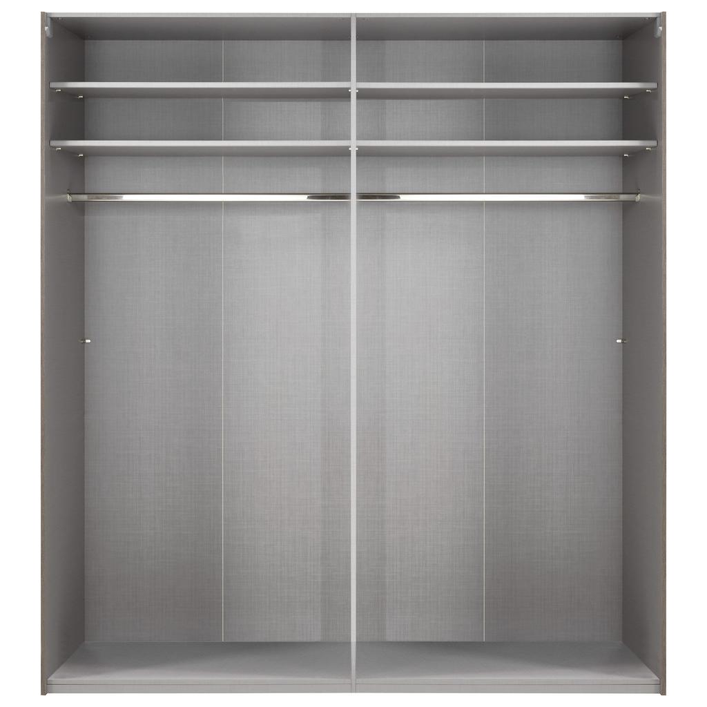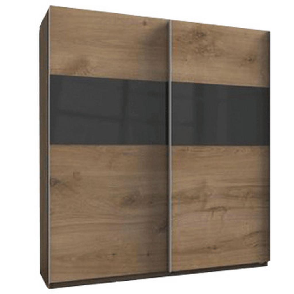 Skriňa s 2 posuvnými dverami v kombinácii dekorov dub doskový/sklo sivé, vnútorné vybavenie tvoria 4 vkladacie police a 2 šatníkové tyče. Skriňa má kovové úchytkové lišty hliníkovej farby. Š/V/H: cca 225/236/65 …
