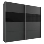 Skriňa s 2 posuvnými dverami v kombinácii dekorov grafitová/sklo čierne, vnútorné vybavenie tvorí 5 vkladacích políc a 3 šatníkové tyče. Skriňa má kovové úchytkové lišty hliníkovej farby. Š/V/H: cca 270/236/65 …