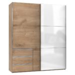 Krásna moderná skriňa je vyhotovená v drevenom dekore, ktorý imituje prírodný dub v kombinácii s moderným bielym sklom. Skriňa s rozmermi cca 200 x 236 x 65 cm (Š/V/H) disponuje dvomi posuvnými dverami, jednými v drevenom dekore, druhými z bieleho skla, čím sa navzájom dopĺňajú v modernom duchu. Naviac sú skrášlené ešte kovovými lištovými úchytmi vo farbe chrómu. Za dverami nájdete dve šatníkové tyče a tri police. Nenápadne zakomponované 4 zásuvky poskytnú ďlaší komfortný priestor na uskladnenie napr. spodnej bielizne. Pozrite si ďalšie skrine z kategórií biele šatníkové skrine, šatníkové skrine dub a dvojdverové šatníkové skrine!