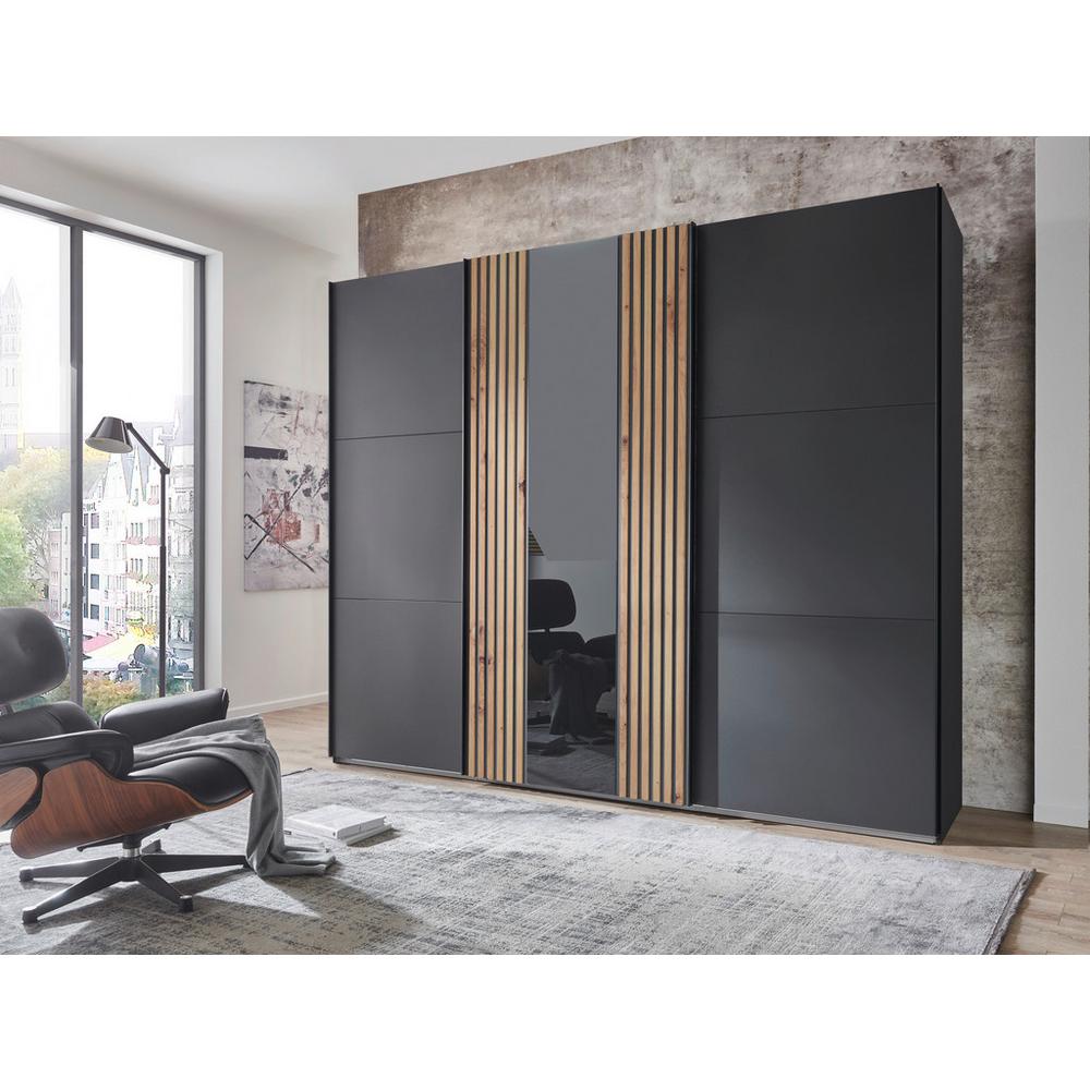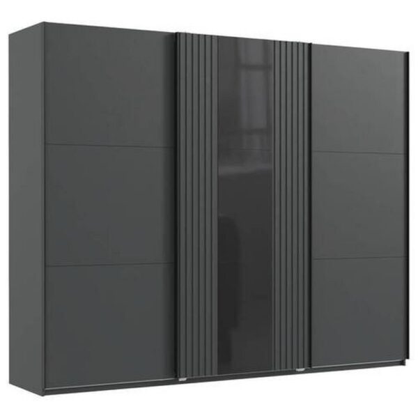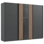 Tento tovar je dostupný IBA ONLINE. Objavte skvelú, modernú šatníkovú skriňu s posuvnými dverami ATLANTA od značky MID.YOU! Skriňa má rozmery cca 250 x 216 x 65 cm (Š x V x H) a bola vyrobená vo veľmi štýlovom prevedení s povrchmi matnej grafitovej farby, pričom jedny z troch posuvných dverí sú skrášlené skleneným panelom vo vysokom lesku a dvomi časťami s vzhľadom akustických panelov v prevedení dub artisan, čo pôsobí veľmi atraktívne. Posuvné dvere sa otvárajú pomocou zvislých lištových úchytov čiernej farby. Interiér skrine ponúka priestor na ukladanie odevov s tromi vešiakovými tyčami a tromi policami, ktoré sú polohovateľné, široké cca 48 a 96 cm, hrubé cca 15 mm a možno ich zaťažiť 6 a 8 kilogramami. Táto šatníková skriňa šikovne kombinuje funkčnosť a štýl! Dostupná je u nás vo viacerých prevedeniach. O kvalite tohto výrobku svedčia aj získané certifikáty a značky kvality ako „BQ – aliancia pre kvalitu“, „DIN EN ISO 9001“ a „Made in Germany“. Tip: Využite príležitosť navrhnúť svoju izbu efektívne a esteticky! Prezrite si náš sortiment, kde nájdete vešiaky na šaty a nohavice, úložné boxy, osvetlenie skr&i