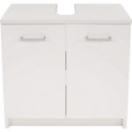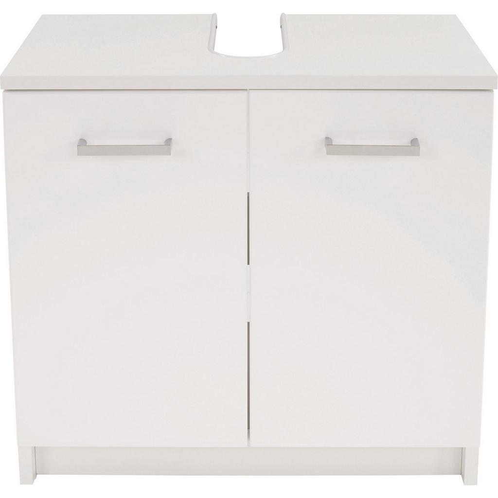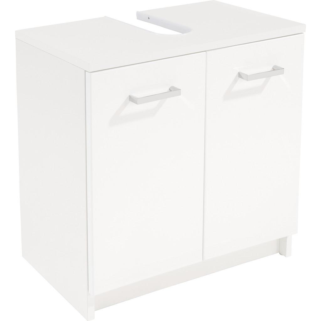 Skrinka pod umývadlo s korpusom v bielej, čelo biela vysoký lesk, s 2 dvermi s kovovými úchytmi farby chrómu. S výrezom na syfón. Š/V/H: cca 55/52,2/30 cm