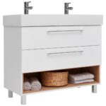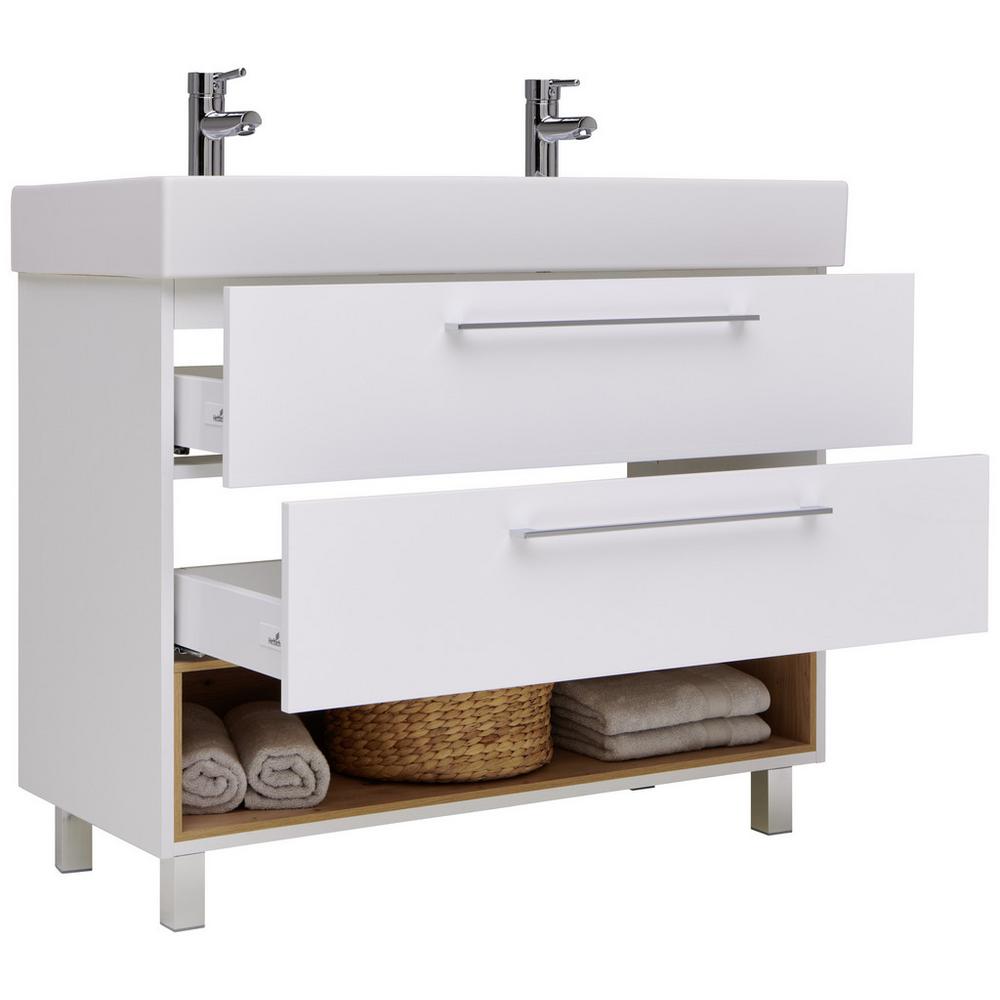 Kúpeľňová séria MURA I vyžaruje modernú sviežosť, telo a predná strana sú vo vysokolesklej bielej farbe a sú osadené dubom Artisan. Pásy držadla v chrómovej farbe a nožičky vo farbe hliníka to niečomu vzhľadom zaručujú.Umývadlová skrinka s rozmermi cca 100 x 90 x 46,5 cm (Š x V x H) ponúka dostatok priestoru pre ošetrujúce výrobky, uteráky alebo sušič vlasov v dvoch veľkých zásuvkách so systémom mäkkého zatvárania a pohodlným vysúvaním. Otvorená priehradka nižšie je k dispozícii pre dekoratívne predmety. Dve umývadlá z bielej keramiky dokonale dotvárajú moderný vzhľad.Premeňte svoju kúpeľňu na wellness oázu so štýlovým nádychom s týmto umývadlom a ďalším nábytkom z tejto série!
