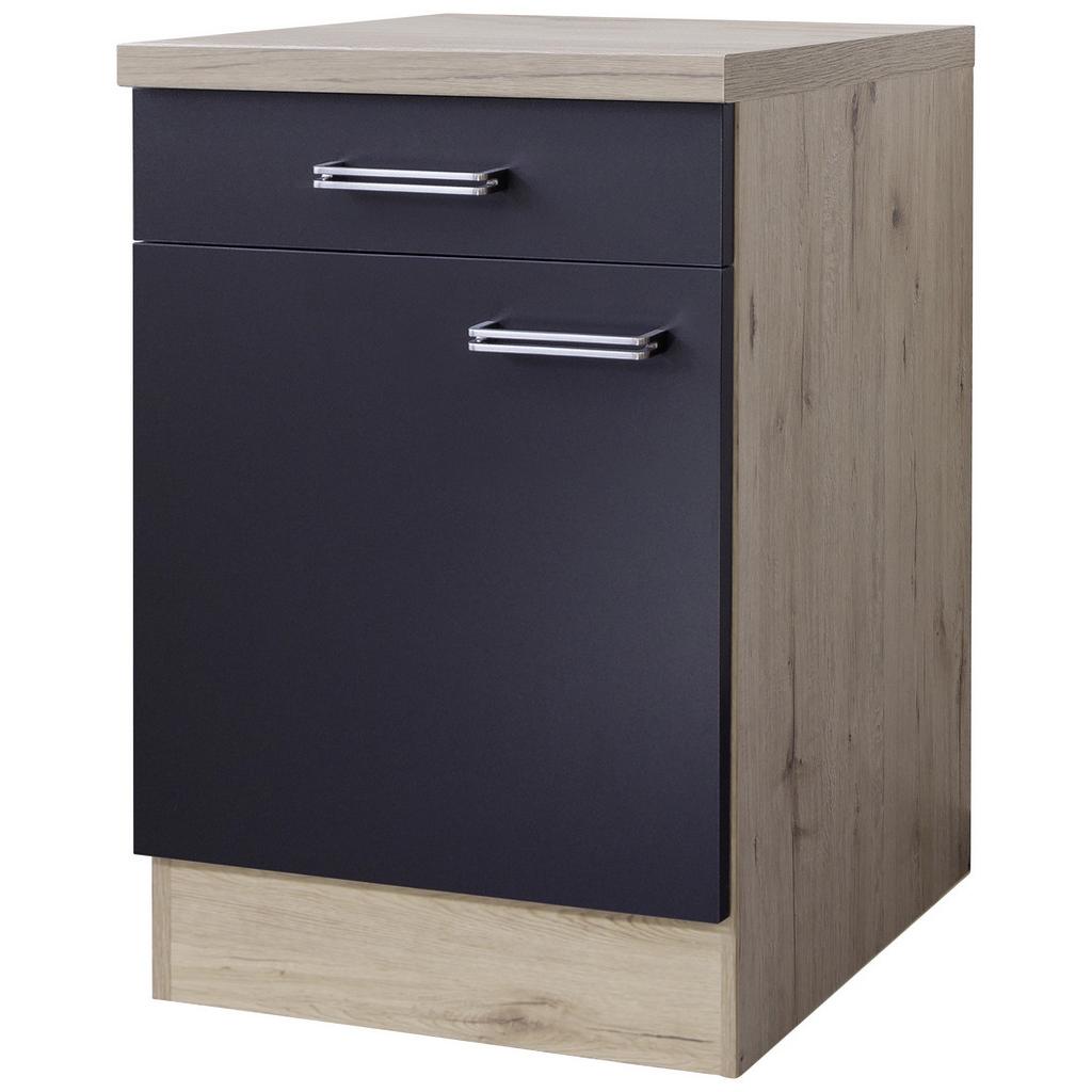 Spodná kuchynská skrinka v kombinácii dekorov dub San Remo a antracitovej, s 1 dverami, 1 zásuvkou a 1 vkladacou policou s nosnosťou 20 kg a úchytkami farby nerezovej ocele. Š/V/H: cca 60/86/60 cm