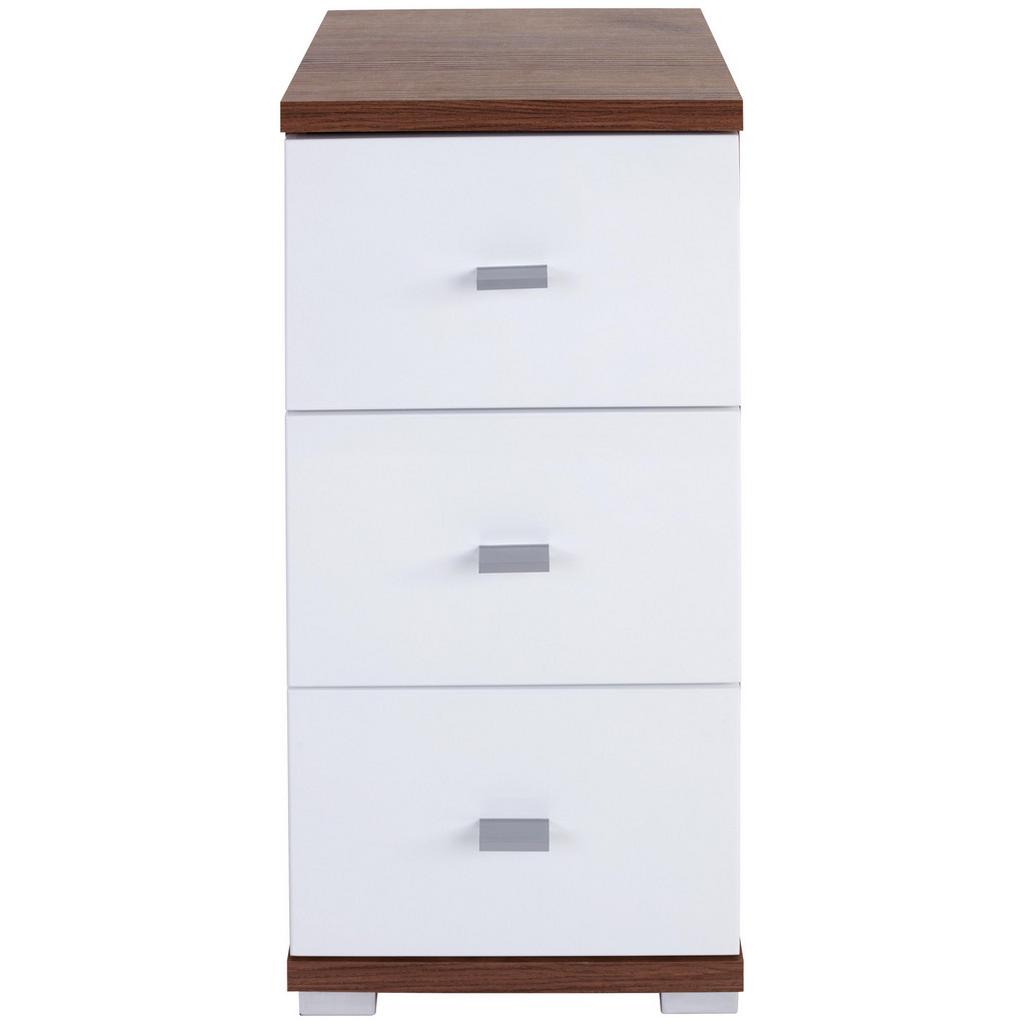 Spodná skrinka s korpusom v dekore dub Kraft tmavý, čelo MDF biele lakované, s 3 zásuvkami, úchytky hliníkovej farby. Š/V/H: cca 35/72/31,5 cm