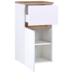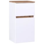 Séria kúpeľňového nábytku MARBELLA by PE Designer 17XZ zaujme obzvlášť krásnou kombináciou čiel vo vysokolesklej bielej a prvkov v dekore dub artisan. Dvierka a zásuvky sa dajú otvárať bez úchytiek, všetok nábytok visí na stene nad podlahou.Spodná skrinka s rozmermi cca 40 x 81 x 35 cm (Š x V x H) má zásuvku a otočné dvierka so systémom soft-close, za ktorými sa nachádza nastaviteľná drevená polica. Od produktov starostlivosti cez uteráky až po fény, je tu dostatok miesta.Zabezpečte si sviežu kombináciu vo vašej kúpeľni doma s touto skrinkou pod umývadlom a ďalším nábytkom zo série!