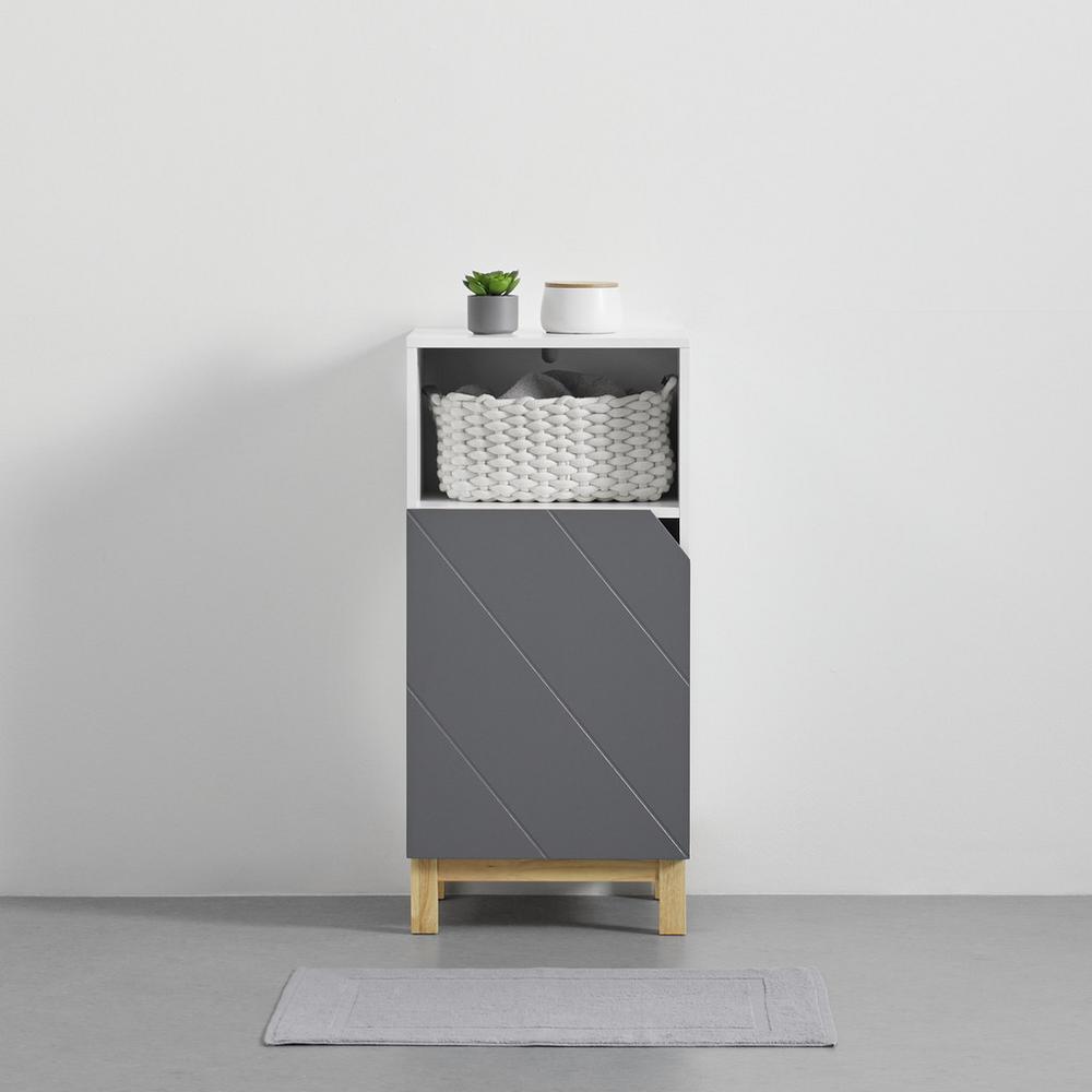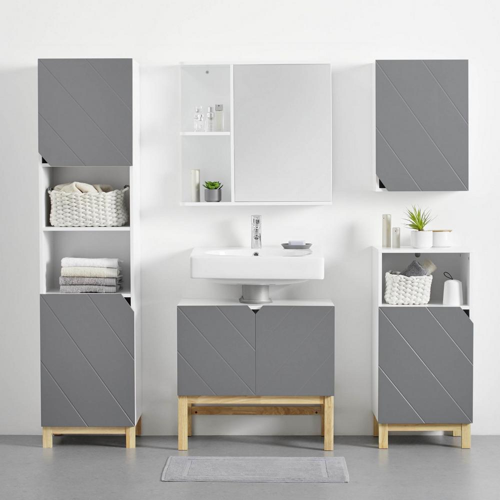 Tento výrobok je k dispozícii iba ONLINE. S touto kúpeľňovou skrinkou v bielej a sivej farbe si môžete do kúpeľne priniesť elegantný kus nábytku. Závesná skrinka je vyrobená z MDF materiálu s korpusom v bielej farbe a dvierkami sivej farby. Dizajnový výrez v ľavom dolnom rohudverí slúži ako úchytka. Zvýraznenie zaisťujú drevené nohy v prírodnej farbe. Skrinka disponuje úložným priestorom vo forme jedného otvoreného priečinku, vrchnej plochy a dvoch priečinkov<