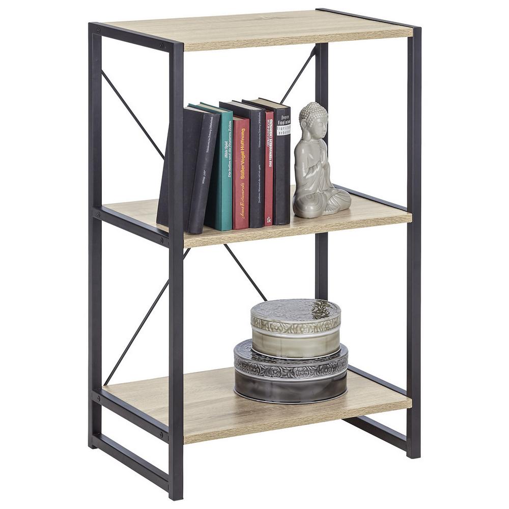Malý regál BONO v odtieňoch dubu v kombinácii s čiernou farbou ponúka praktické úložné priečinky a zapôsobí svojím industriálnymvzhľadom. Pre milovníkov tohto štýlu je k dispozícii ďalší trendovýnábytok zo série BONO. Regál s rozmermi približne 50 x 79 x 35 cm (Š x V x H) má kovový rám s 3 policami z MDF s dekorom dubu sonoma, ktoré tvoria praktické úložné miesto či už v jedálni, pracovni alebo obývacej izbe. Najdôležitejšie informácie: Rozmery: cca 50 x 79 x 35 cm (Š/V/H) Materiál: železo – práškom ošetrené, MDF, dekor dub sonoma Farba: prírodná drevená, čierna Počet otvorených políc: 3 Hrúbka materiálu: cca 15 mm
