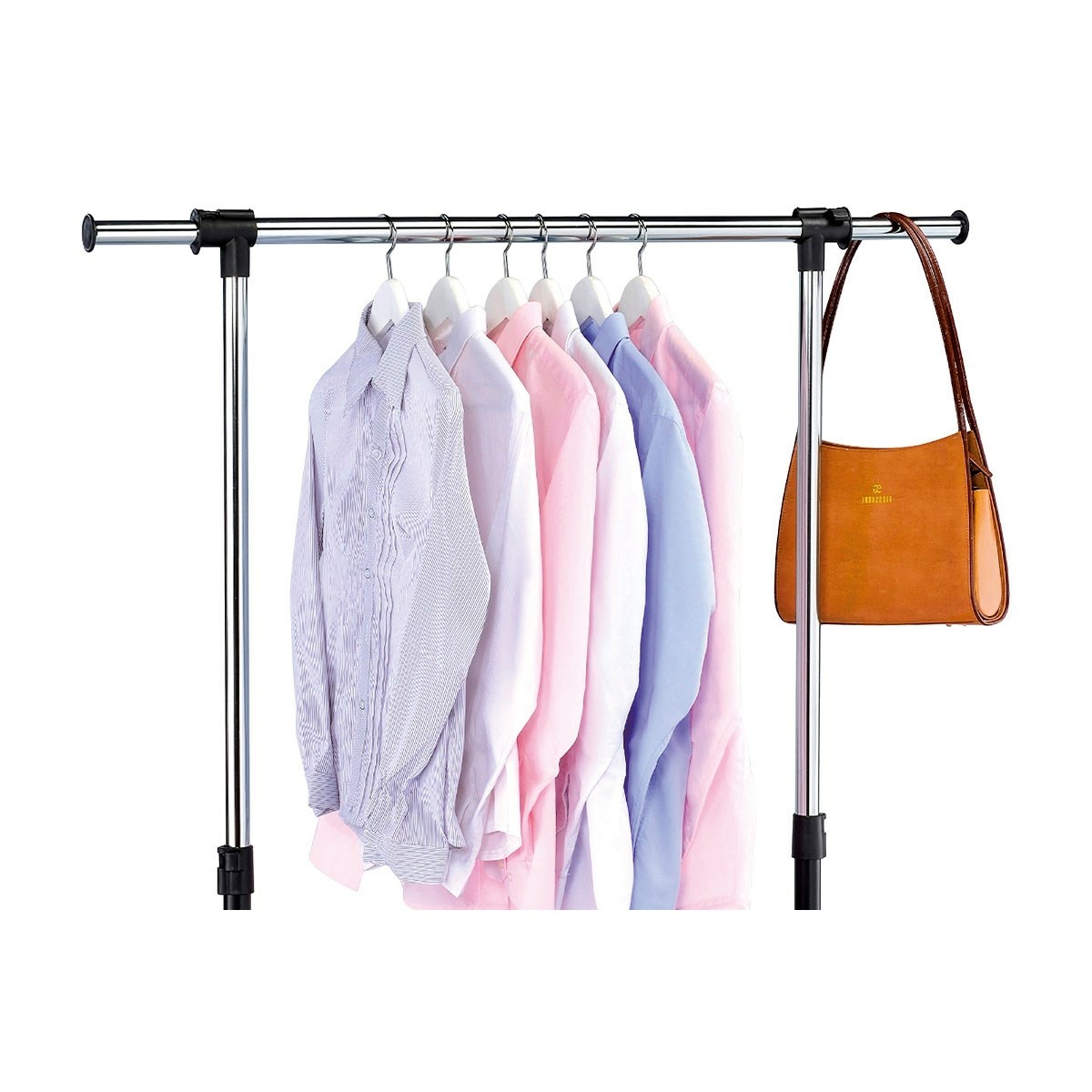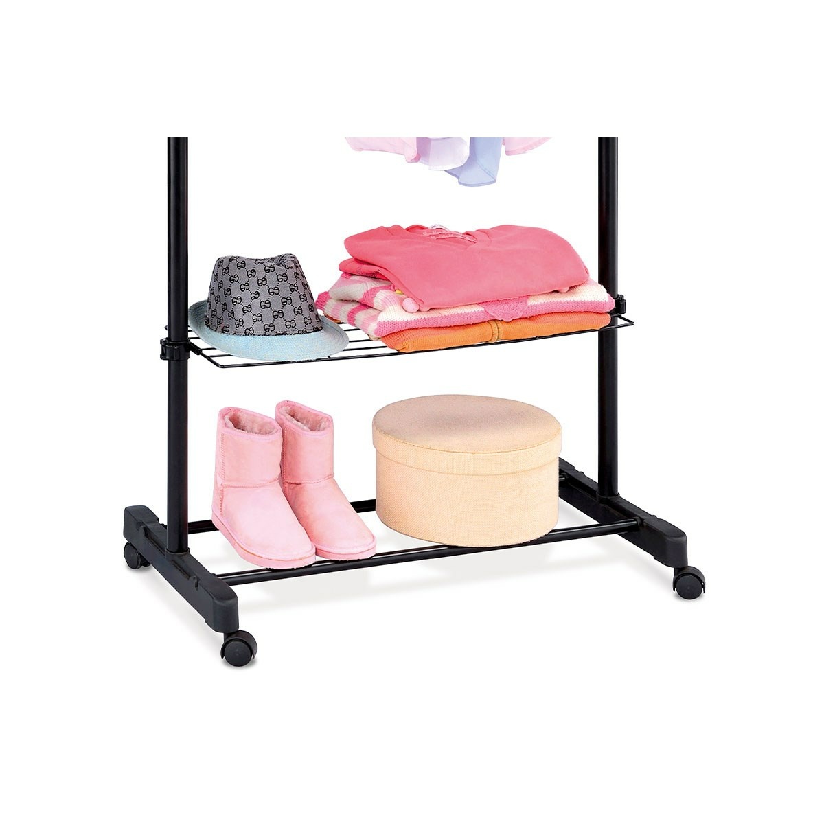 Chcete mať obľúbené kúsky oblečenia stále po ruke? Kúpte si tento jednoduchý a praktický stojan. Malé držiaky po stranách umožňujú zavesenie tašiek a kabeliek, poličky sú praktické na odkladanie škatúľ alebo topánok. Vďaka kolieskam ho môžete bez problému presúvať, kam práve potrebujete.