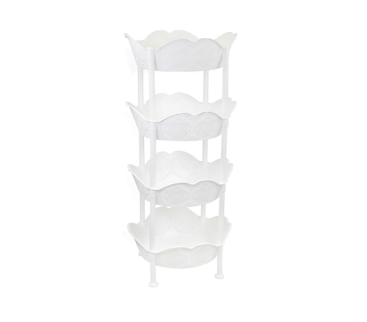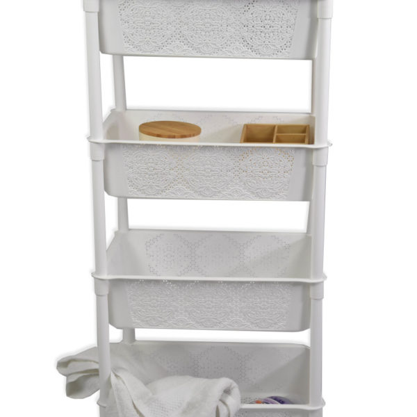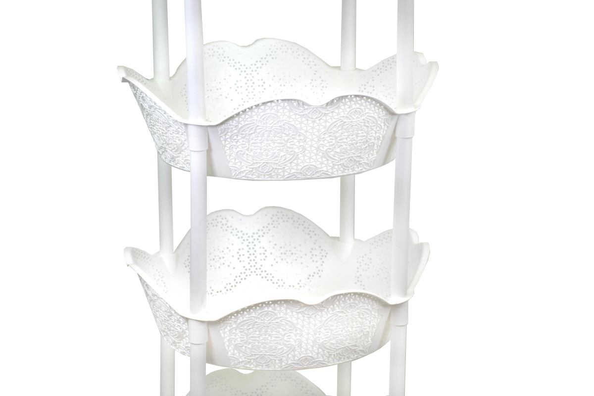 Poschodový stojan so 4 zdobenými košíkmi dokáže vaše veci udržať v prehľadnom poriadku. Využijete ho v každej miestnosti vášho domova. Najpraktickejší spôsob, ako uložiť kozmetiku, čistiace prostriedky, ale aj množstvo ďalších vecí z domácnosti.Stojan s košíkmiK praktickému uloženiu kozmetiky, čistiacich prostriedkov a i.4 zdobené košíkyNa využitie v celej domácnosti Materiál: plast. Rozmery: 39,5 x 39,5 x 83 cm.
