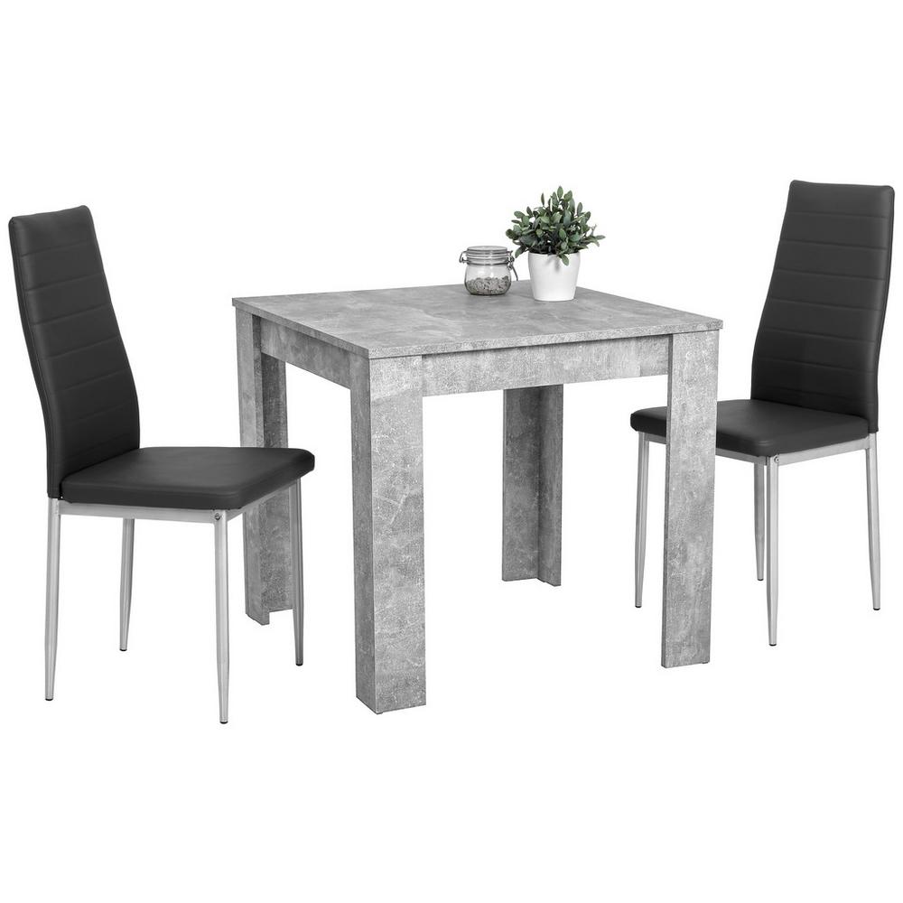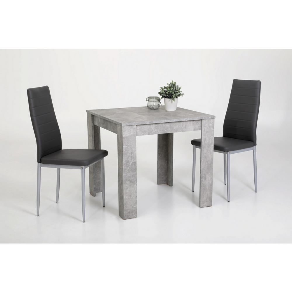 3-dielna zostava do jedálne, skladá sa z: 1x stôl v dekore beton a 2 stoličky s poťahom v sivej textilnej koži, s kovovými nohami hliníkovej farby, s nosnosťou 100 kg,výška sedu: 47 cm, stôl: 80/74/80, stolička: 42/98/44 cm.